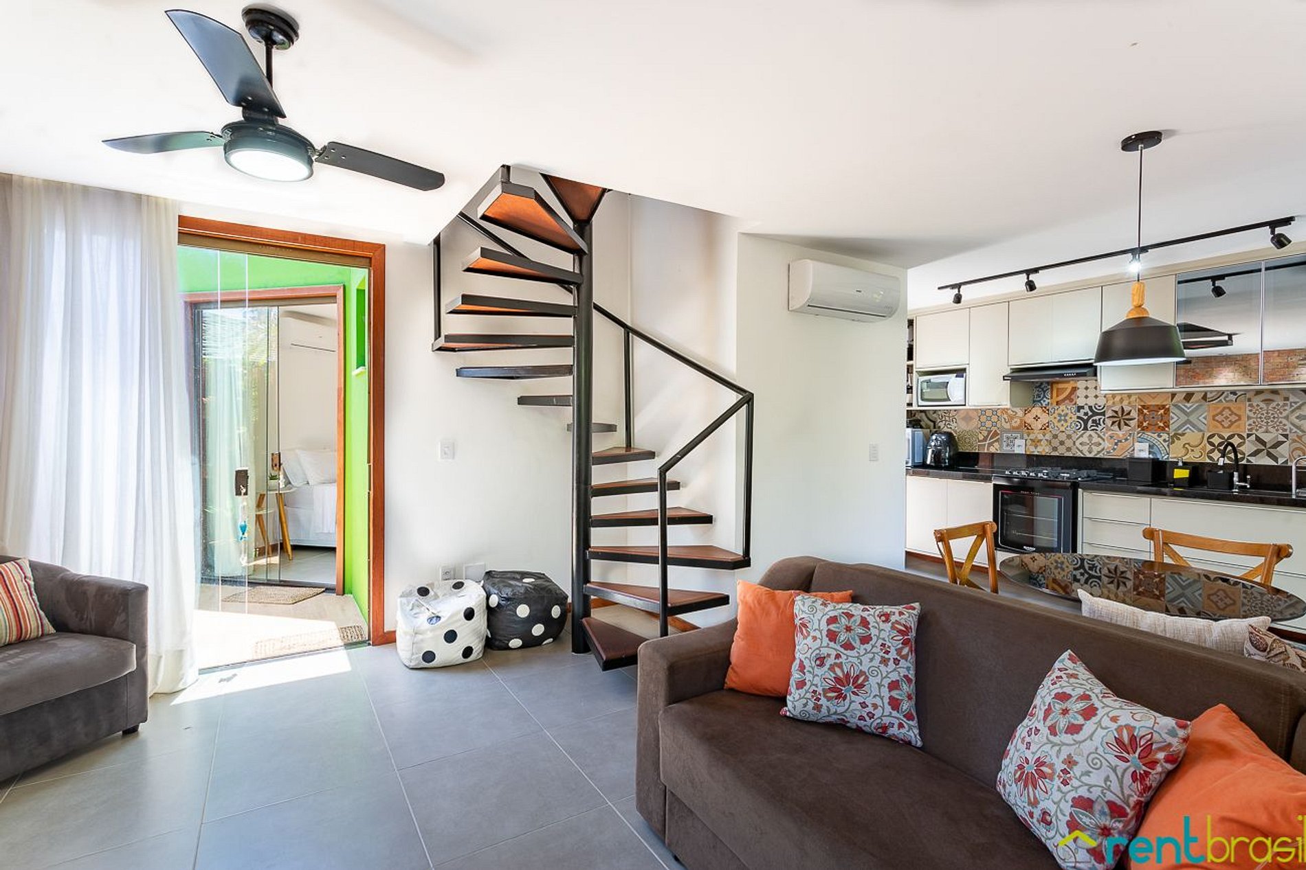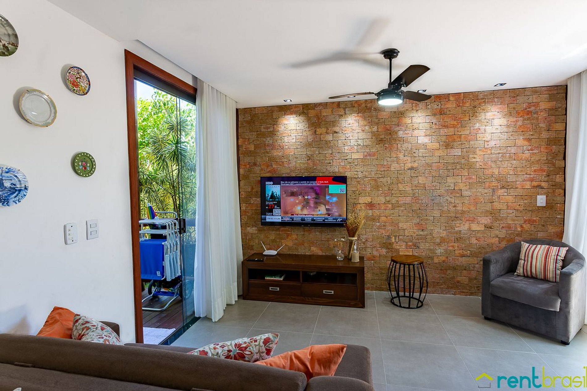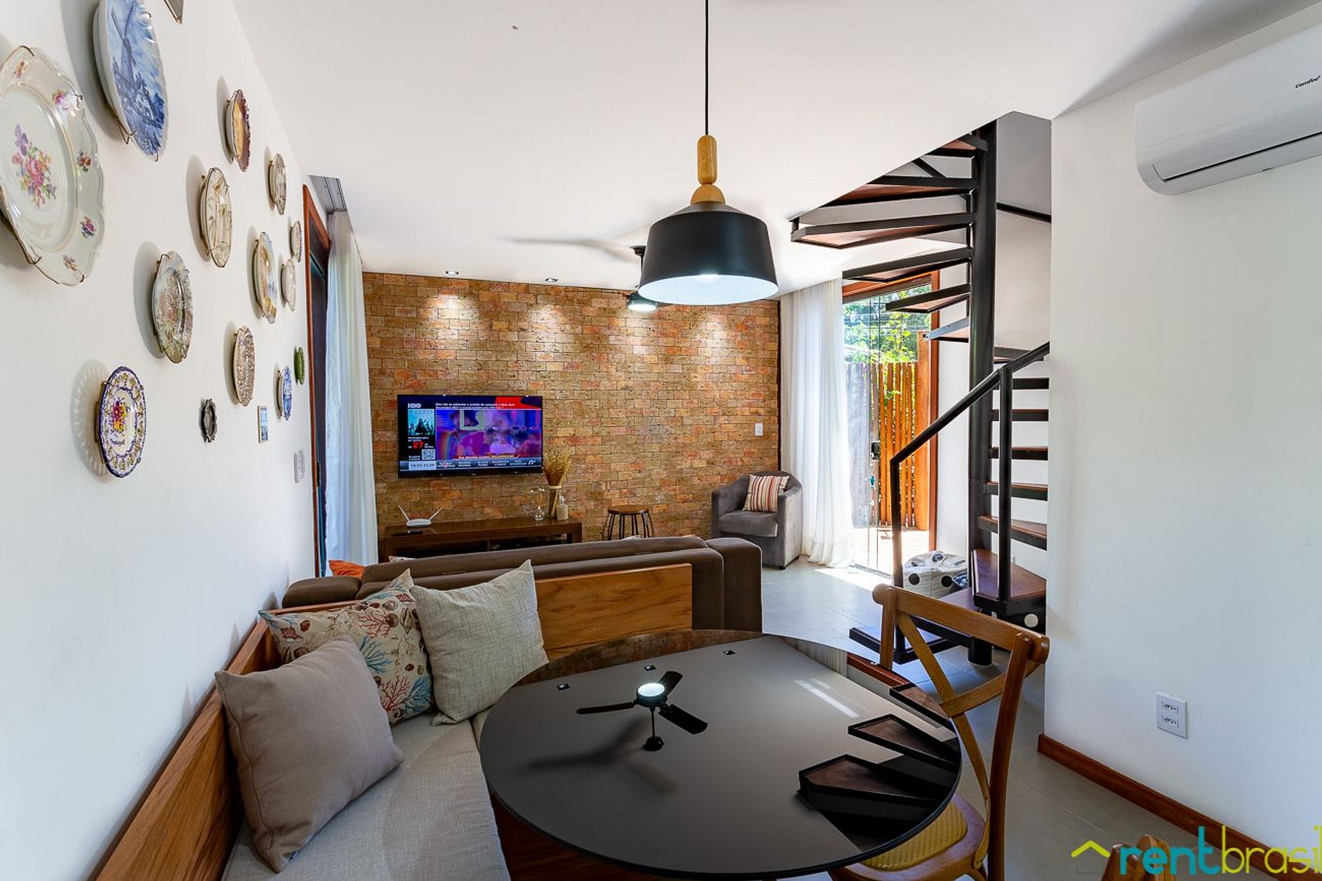 A Sala tem uma Smart TV (50") e o espaço é integrado com uma cozinha completa, lavabo e área de serviço com máquina de lavar roupa. A primeira suíte é no andar térreo. Existe também um pequeno pátio ao ar livre onde tem um chuveirão para se refrescar. No andar superior tem mais duas suítes de casal, com acesso a uma espaçosa varanda mobiliada com rede, jogo de mesa com cadeiras e sofá.