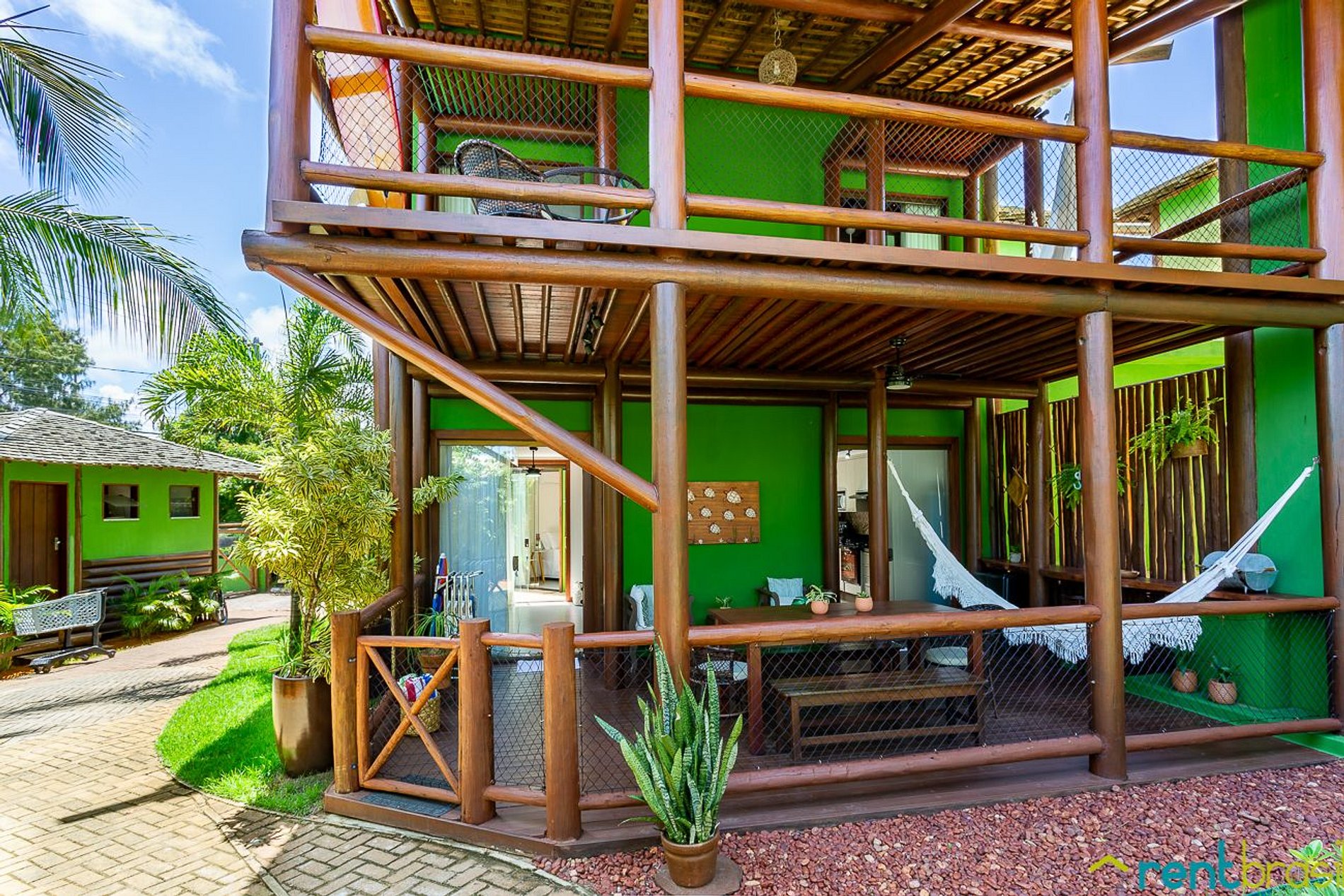 A entrada é feita pela varanda da casa, bem acessível e sem escadas. A varanda é bem ampla e oferece todo o conforto necessário, como: conjunto de mesa e cadeiras, poltronas, rede, churrasqueira e uma cervejeira para curtir os bons momentos.