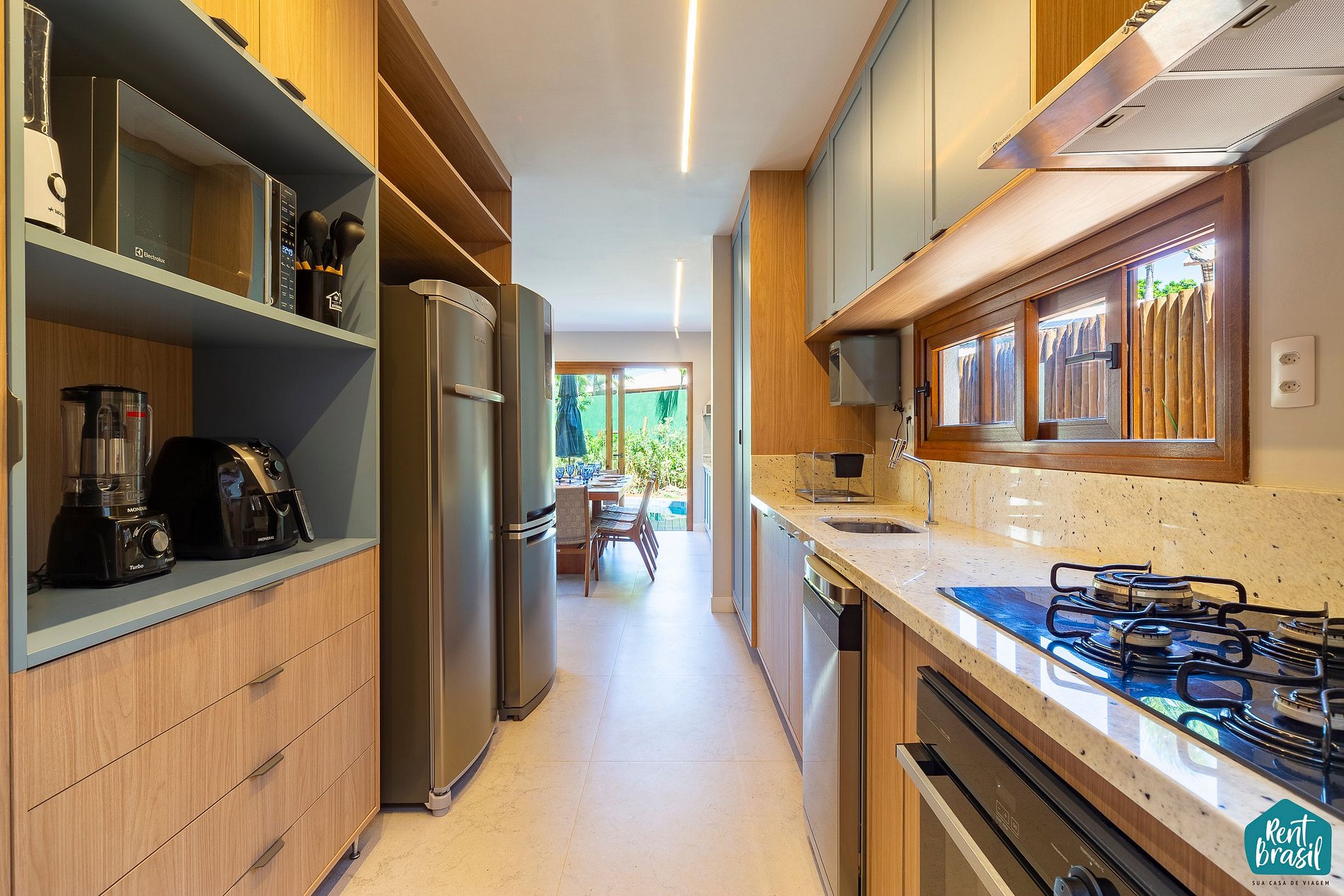 4 air-conditioned suites providing a better night's sleep; Air-conditioned living room with Smart TV to relax after a day at the beach and pool; Fully equipped kitchen with top-of-the-line appliances: microwave, dishwasher, air fryer, stove, refrigerator, coffee maker and Nespresso machine, plus water filter and utensils; The outdoor area has a complete space to enjoy with family and friends: loveseat, a table, wine cellar, barbecue to complete the space which includes a private pool; Service area with laundry and clothesline for your convenience.