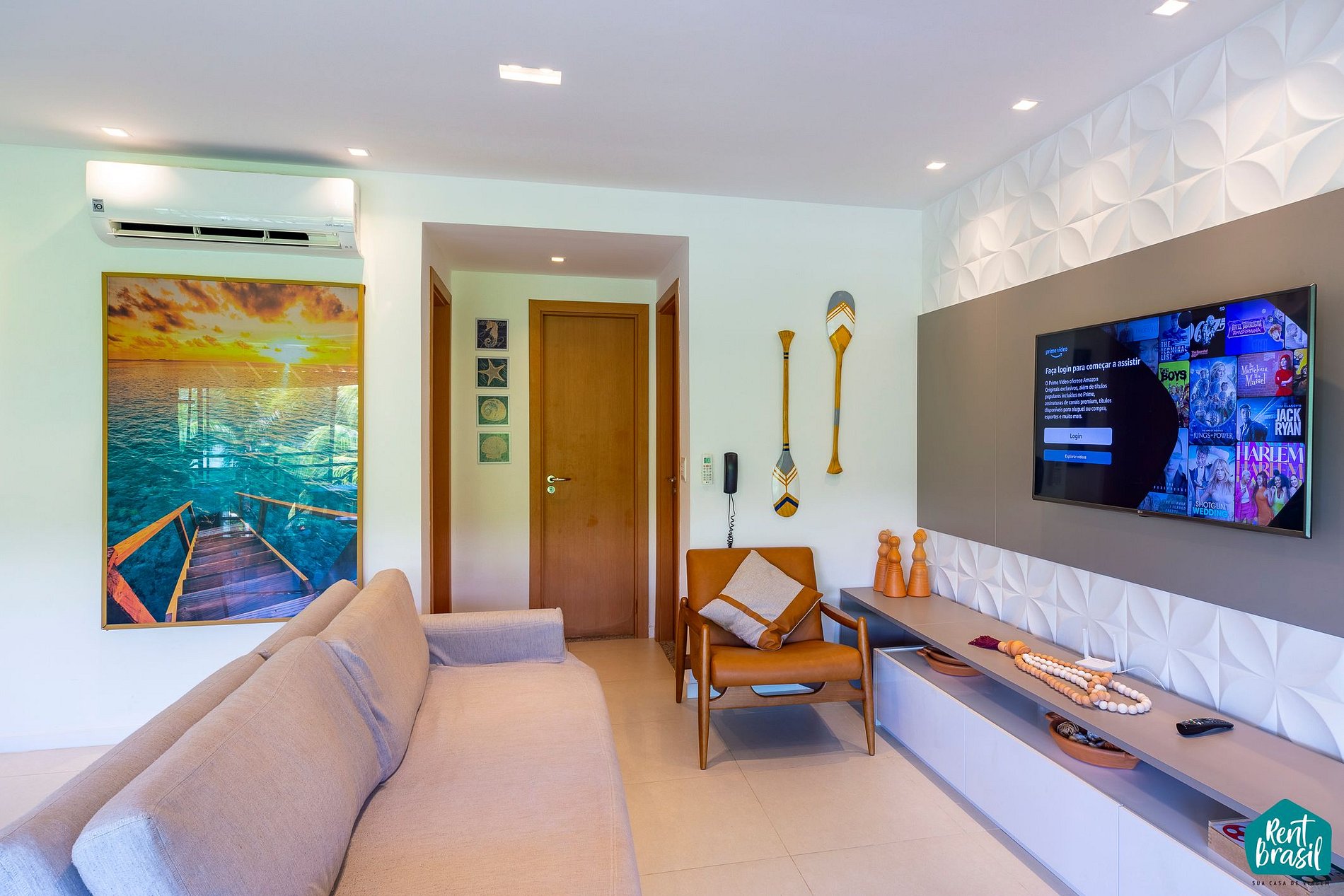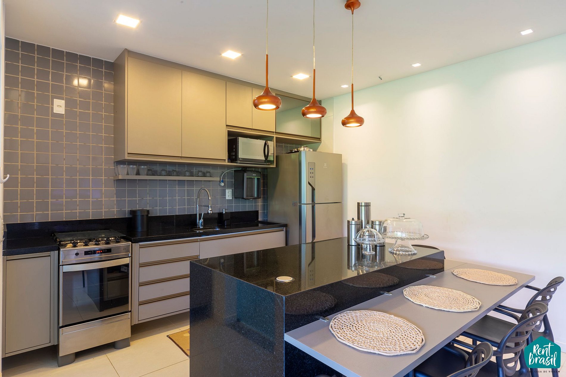 Both are air-conditioned. The living room is integrated with the kitchen (both air-conditioned), which includes a sofa, Smart TV, and a stylishly decorated environment. The kitchen is fully equipped with a refrigerator, stove, oven, water filter, microwave, air fryer, beer cooler, and utensils. The balcony guarantees an airy and comfortable environment with a small table to gather with friends and family during your vacation rental. The apartment also has a powder room and a laundry area equipped with a washing machine.
