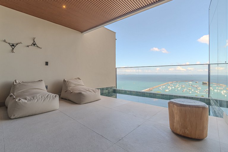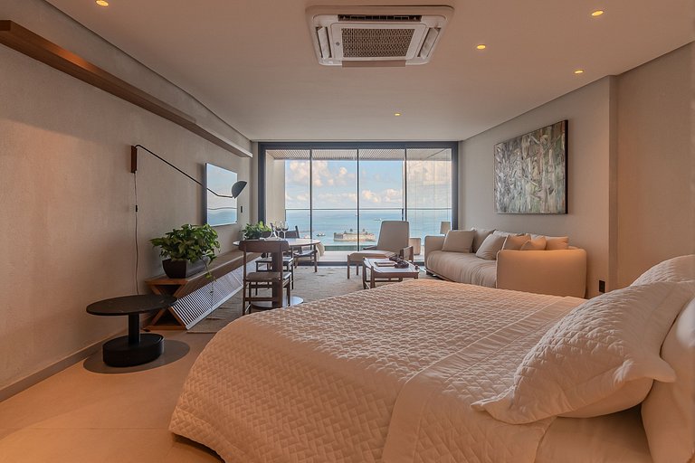 O studio duplo pensado pelo arquiteto Rogério Menezes é climatizado e conta com enxoval completo. Nele você encontra sala de estar e jantar integradas, lavabo e cozinha equipada com utensílios e eletrodomésticos que facilitam o seu dia-a-dia. O ambiente é um verdadeiro tributo à produção artística local. O mais completo studio da cidade! nele você terá o prazer de acordar com a vista da varanda para a Baía de Todos os Santos, que se estende de maneira acolhedora, e aproveitar a piscina privativa em um ambiente clean e acolhedor.