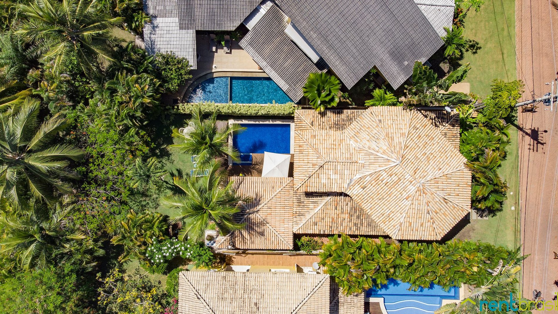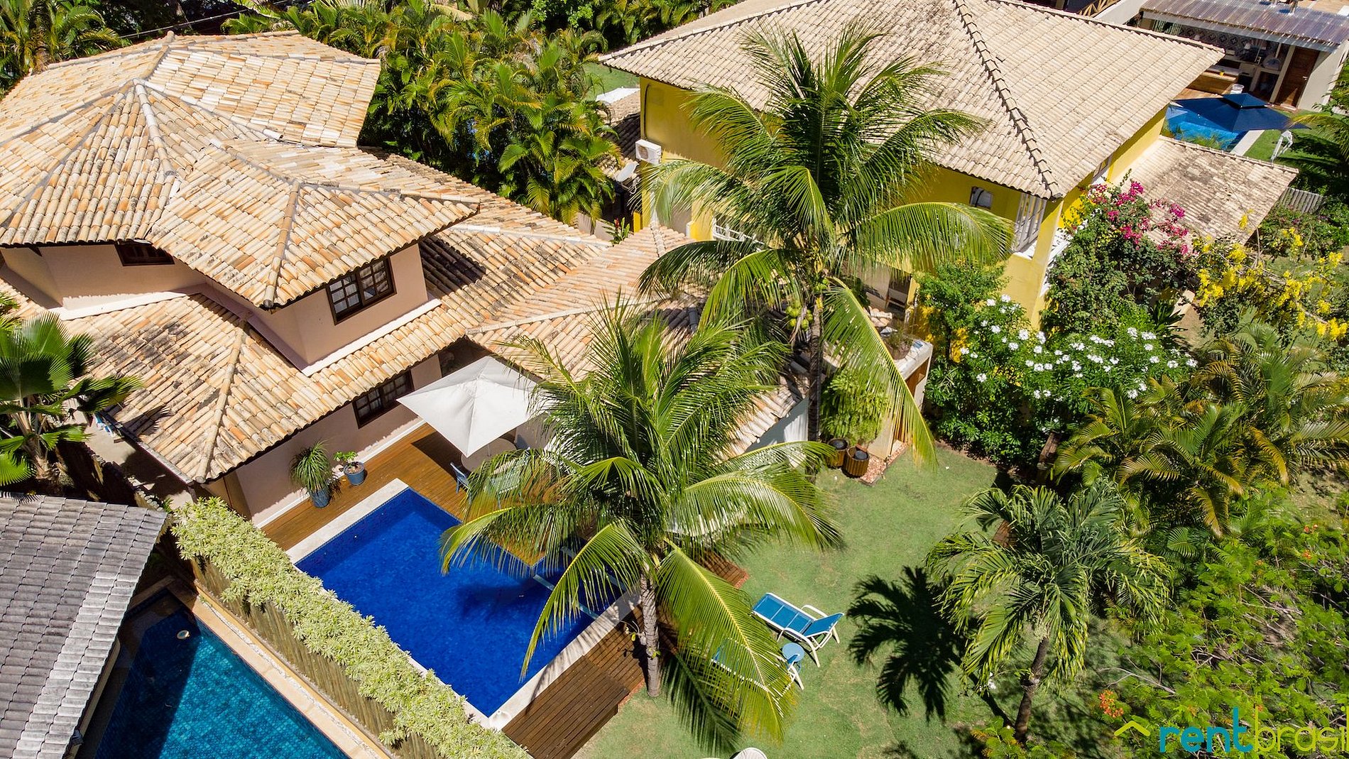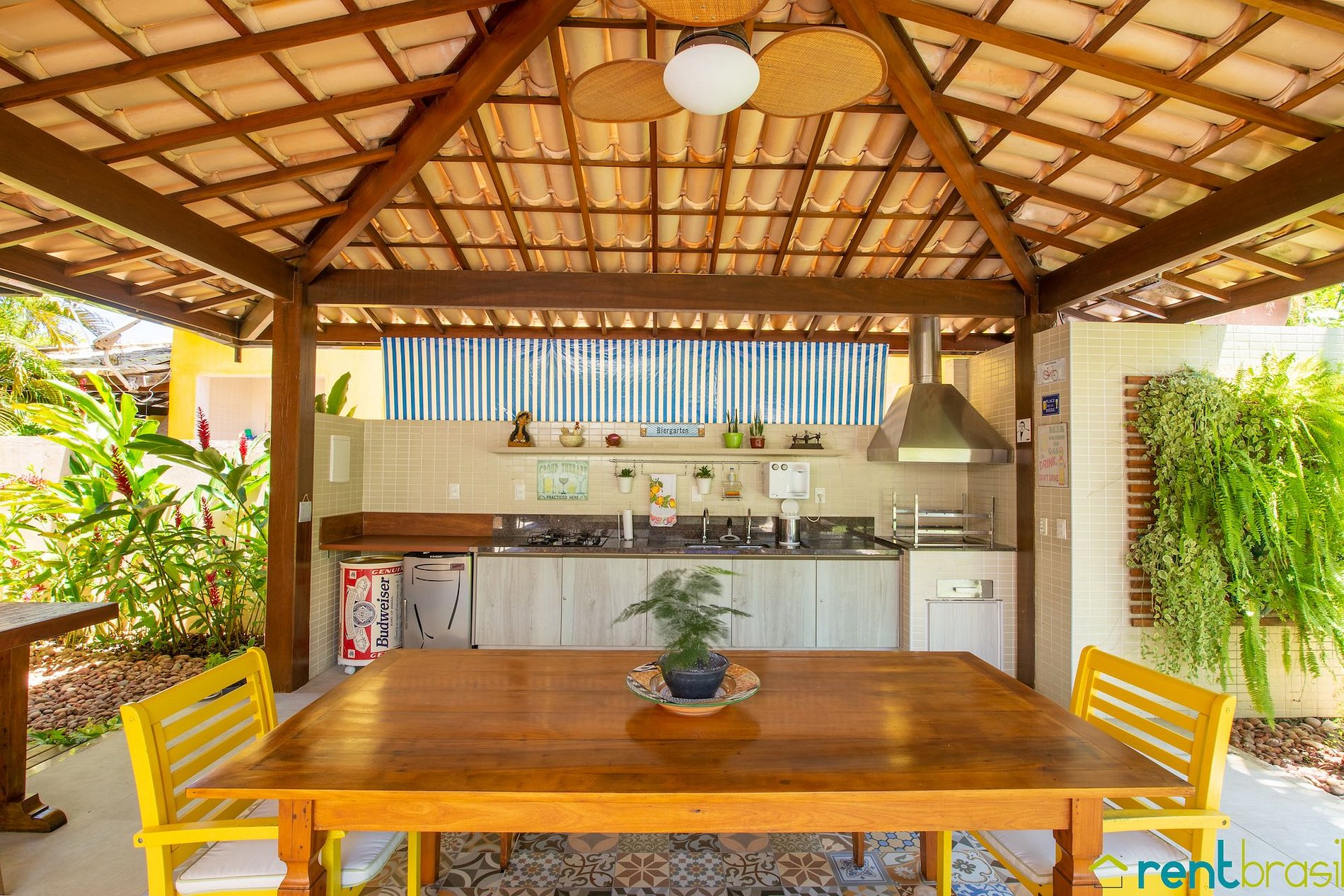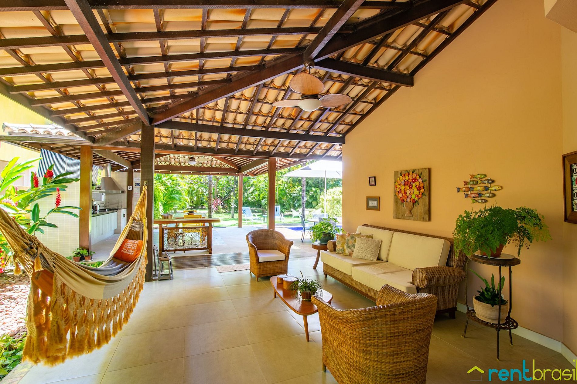 A entrada da casa se faz por uma grande varanda lateral, muito aconchegante! Esta nos leva até um maravilhoso Espaço Gourmet (com churrasqueira, cooktop, cervejeira, etc…), Piscina e Jardim, onde temos mesas e espreguiçadeiras para curtir à vontade o Sol da Bahia. A área externa da casa é fantástica! Bem cuidada e privativa.