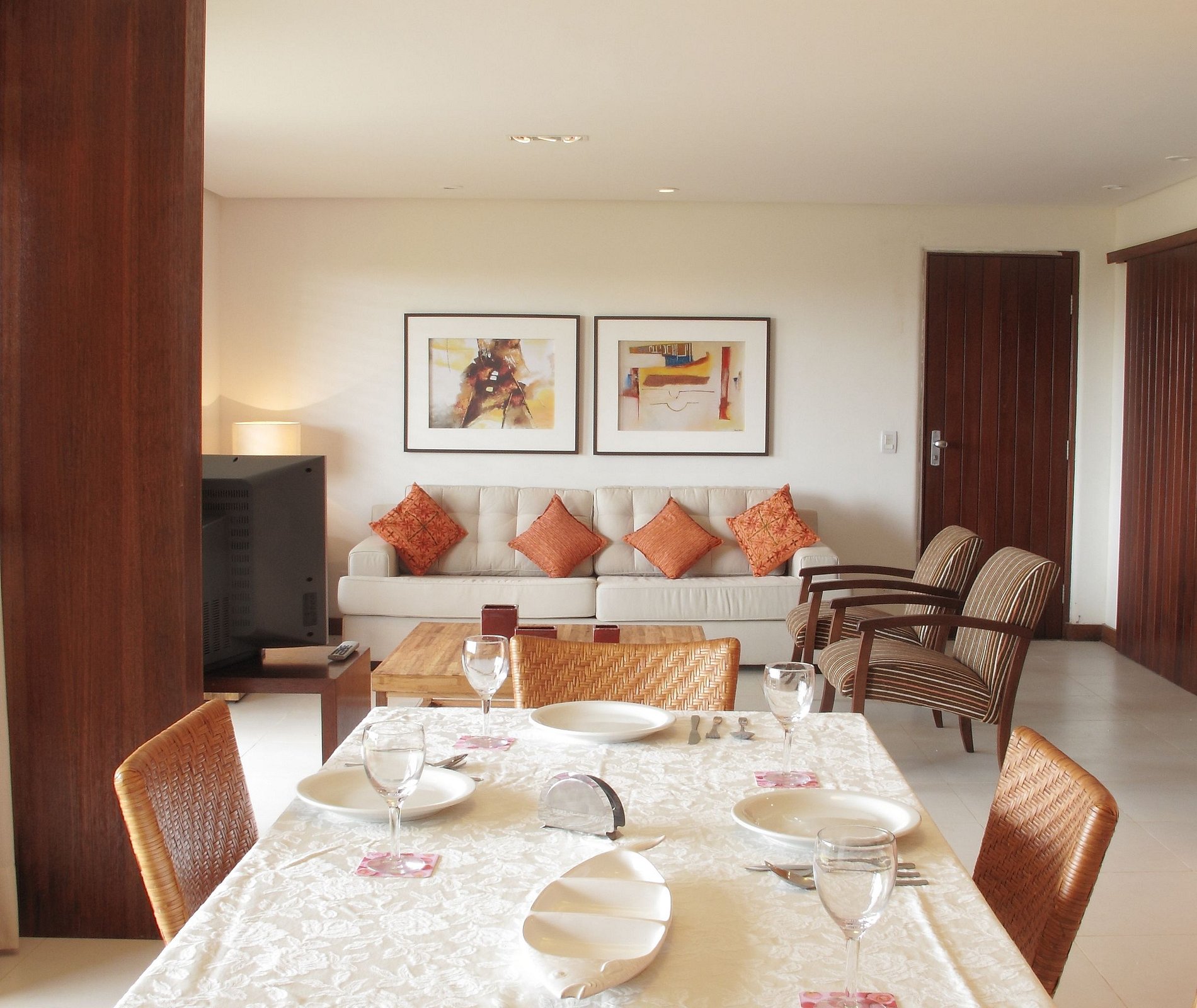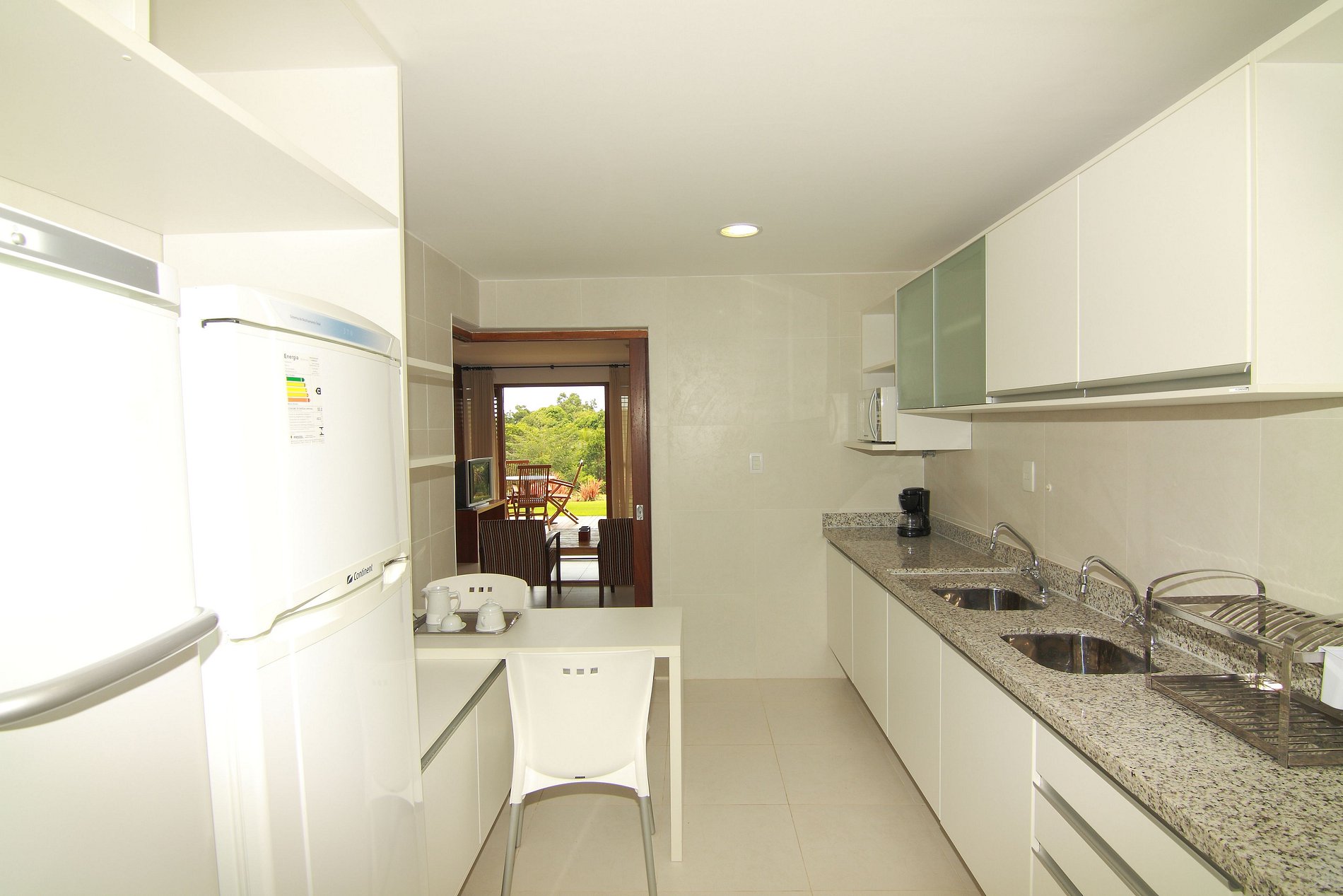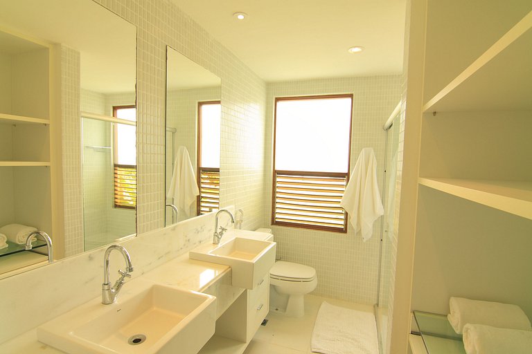 The apartment is on the ground floor, very close to the Club and has a very nice view of the beach and the forest. In the 156 m2 that it has, it has 3 double suites equipped with air conditioning, service area with washing machine, maid's room (without air conditioning), living room and dining room, toilet and a large balcony that gives access to the garden. TV with open channels. Kitchen 100% equipped, cooker, refrigerator and microwave. Bed and bath linen are included.