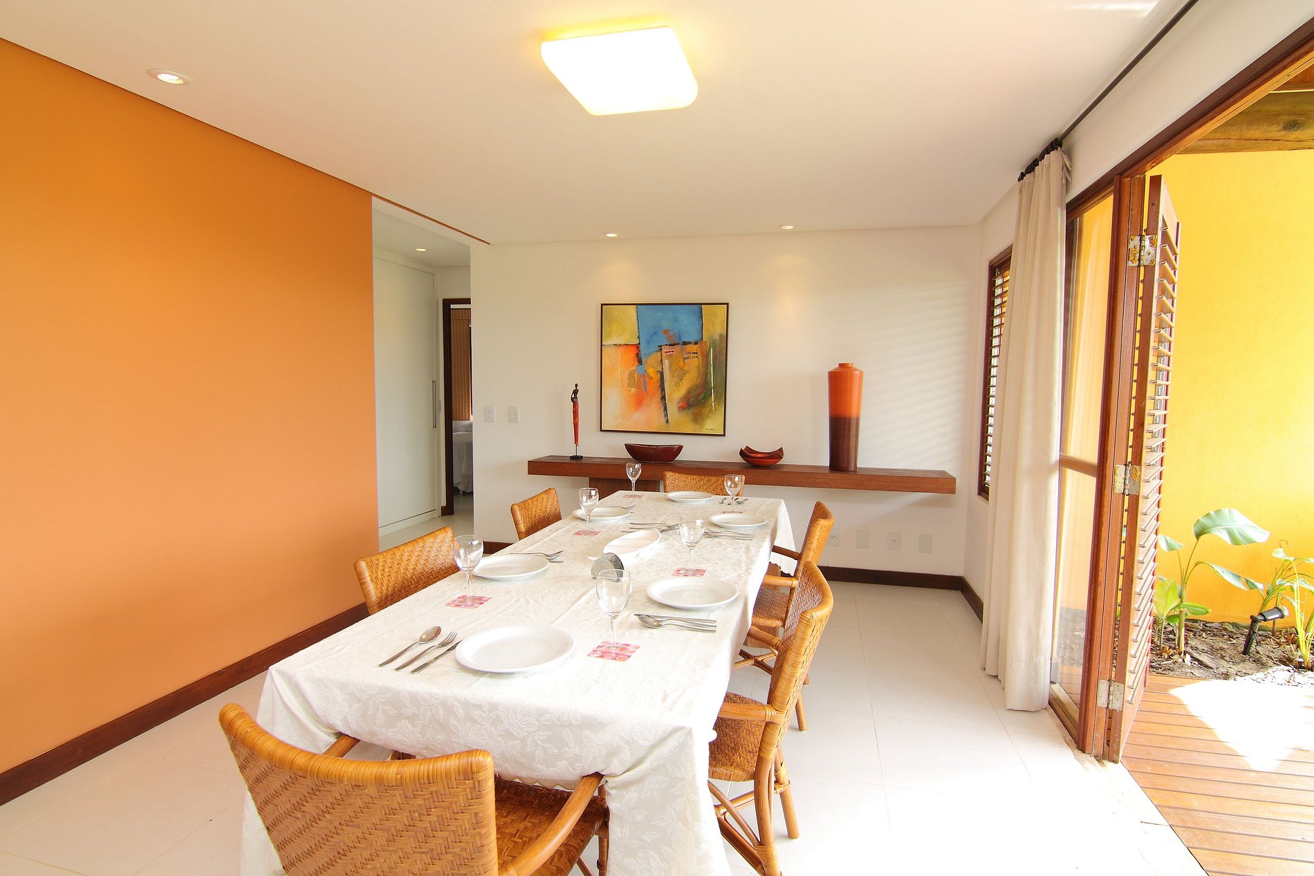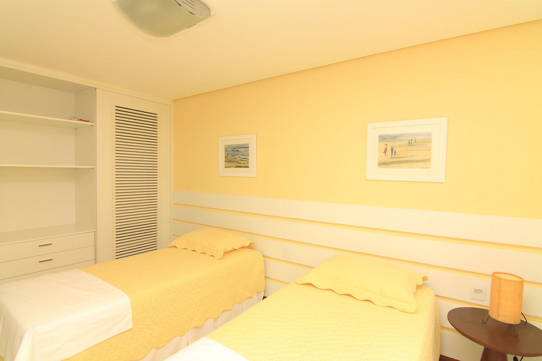 The apartment is on the ground floor, very close to the Club and has a very nice view of the beach and the forest. In the 156 m2 that it has, it has 3 double suites equipped with air conditioning, service area with washing machine, maid's room (without air conditioning), living room and dining room, toilet and a large balcony that gives access to the garden. TV with open channels. Kitchen 100% equipped, cooker, refrigerator and microwave. Bed and bath linen are included.