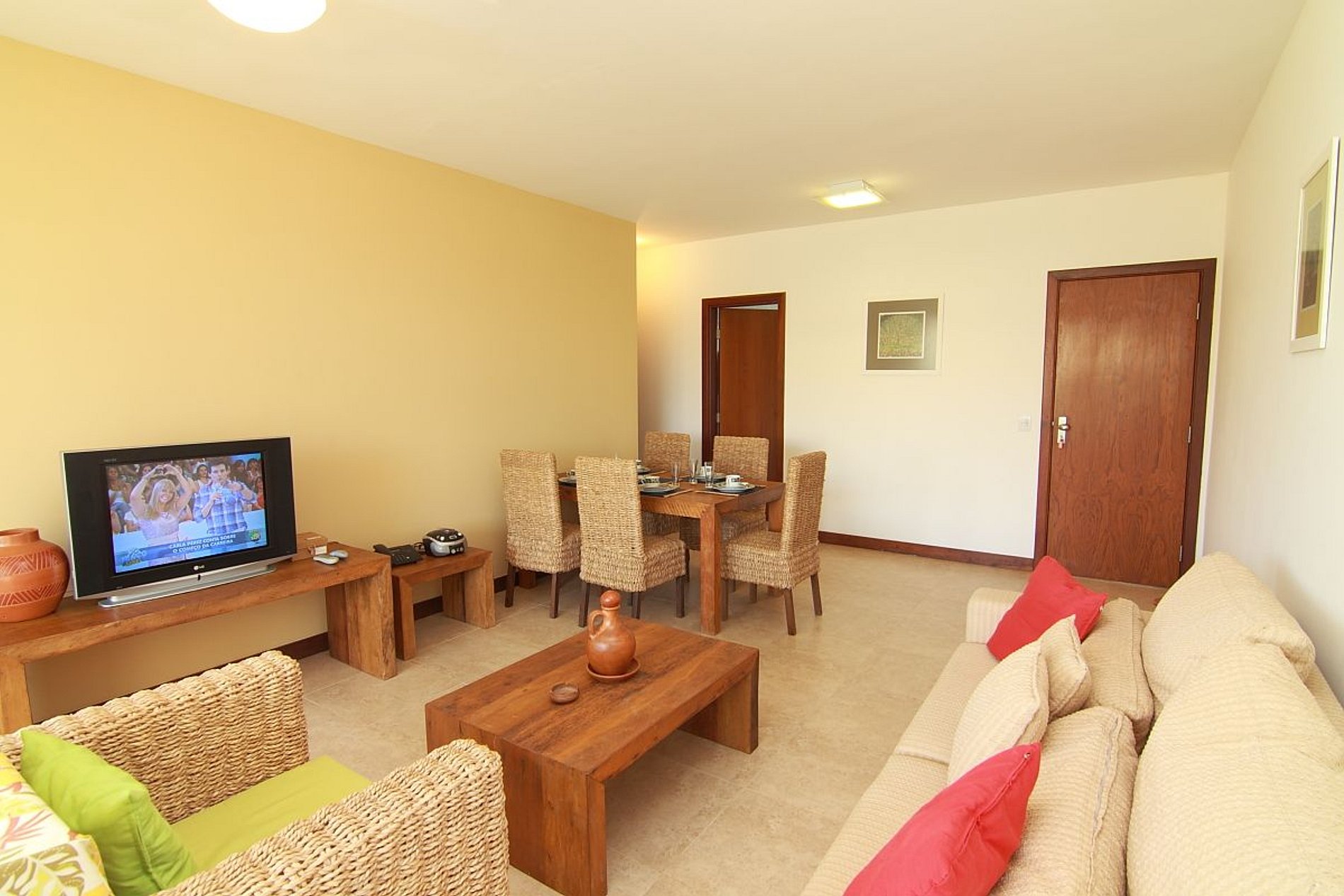 Apartamento de alto padrão com 118 m2 com 3 suítes duplas equipadas com ar condicionado + dependência de empregada, sala de estar e de jantar, lavabo e varanda. TV a cabo + rádio CD. Cozinha 100% equipada com lavadoura de roupa, fogão, geladeira e microondas. Roupas de cama, mesa e banho. O apartamento é decorado com muito estilo e bom gosto, todo equipado e comporta confortavelmente até 6 pessoas.
