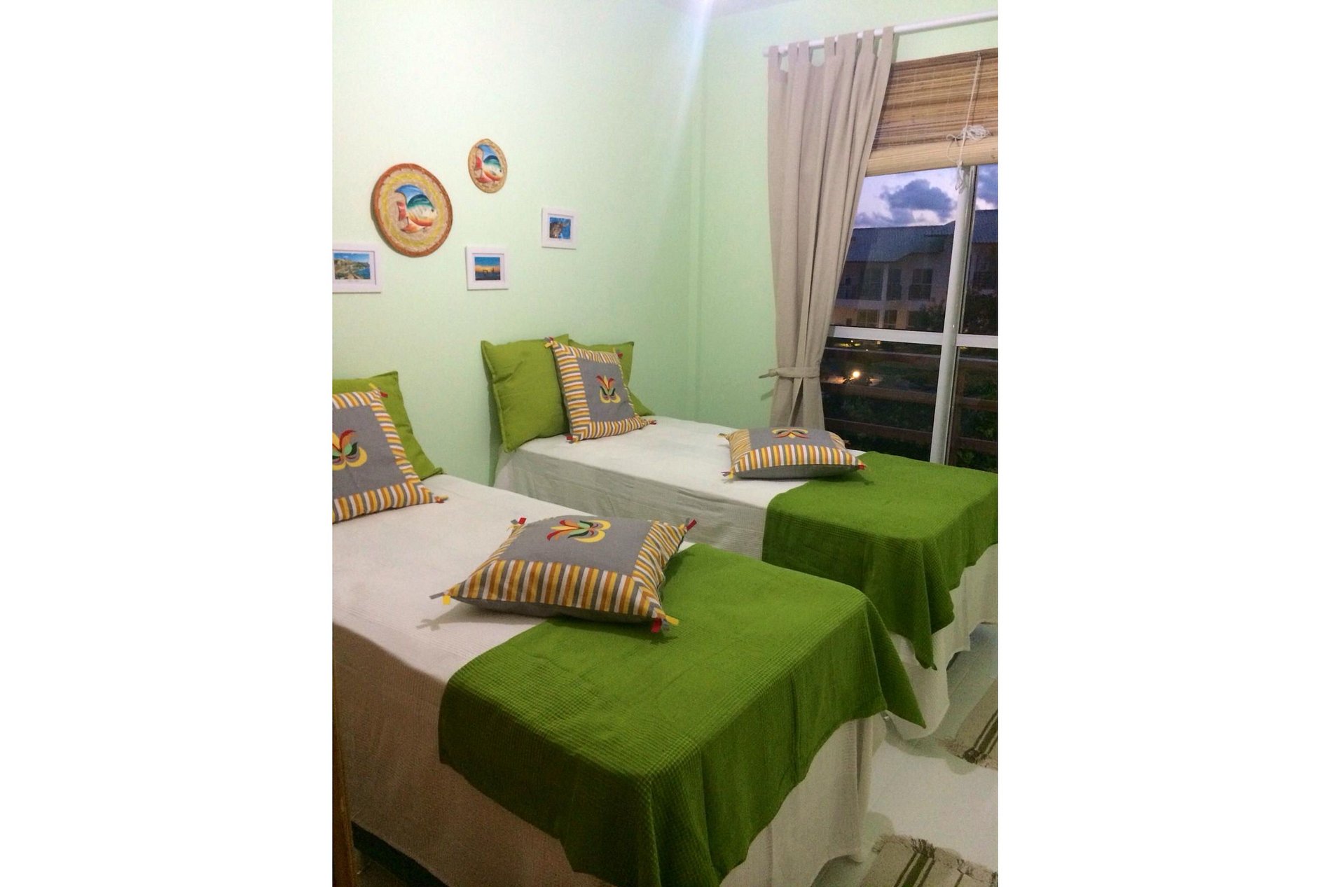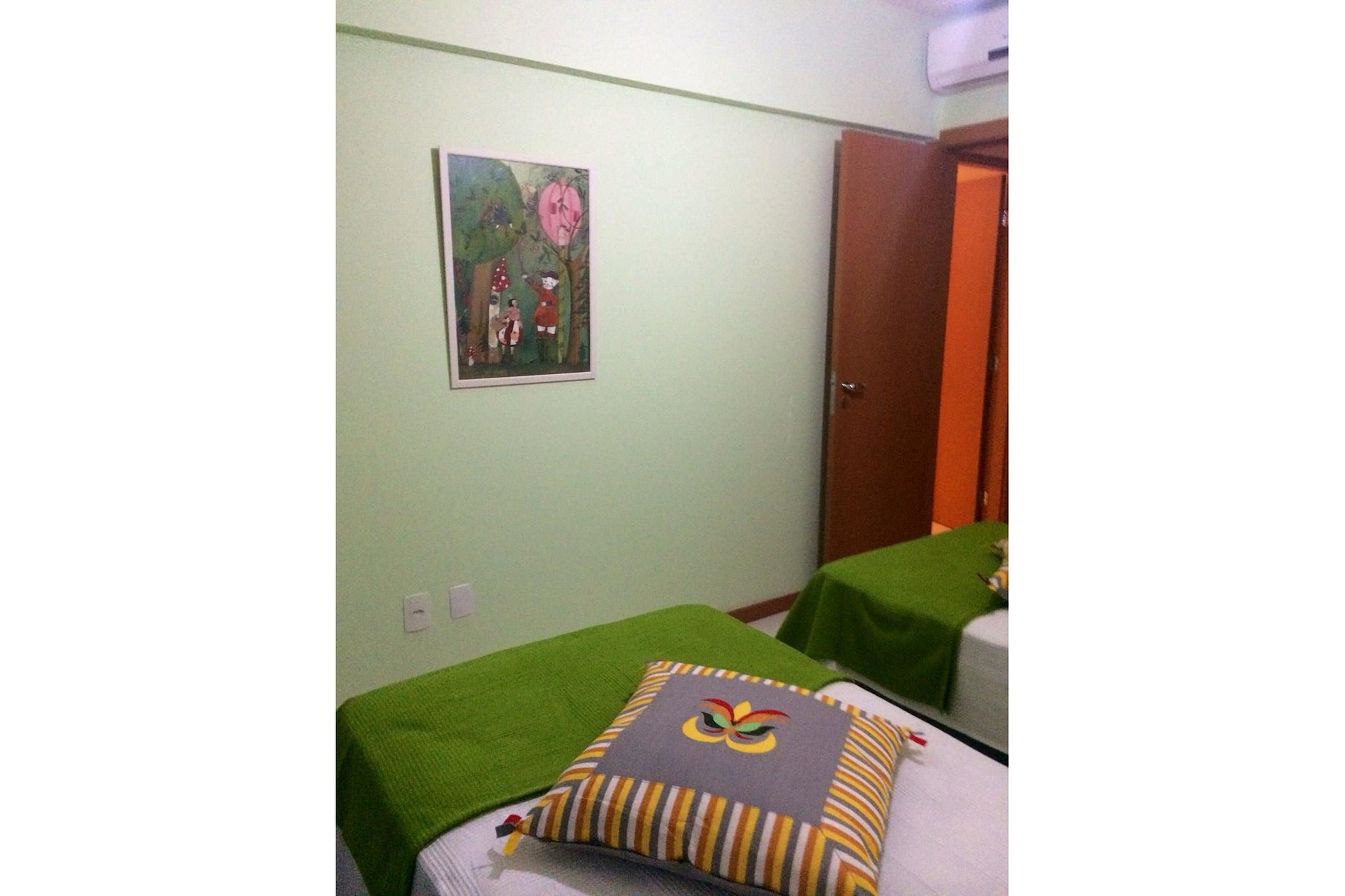 Apartamento de 2 quartos sendo 1 deles suíte. Os 2 quartos são climatizados e possuem 2 camas de solteiro em cada.