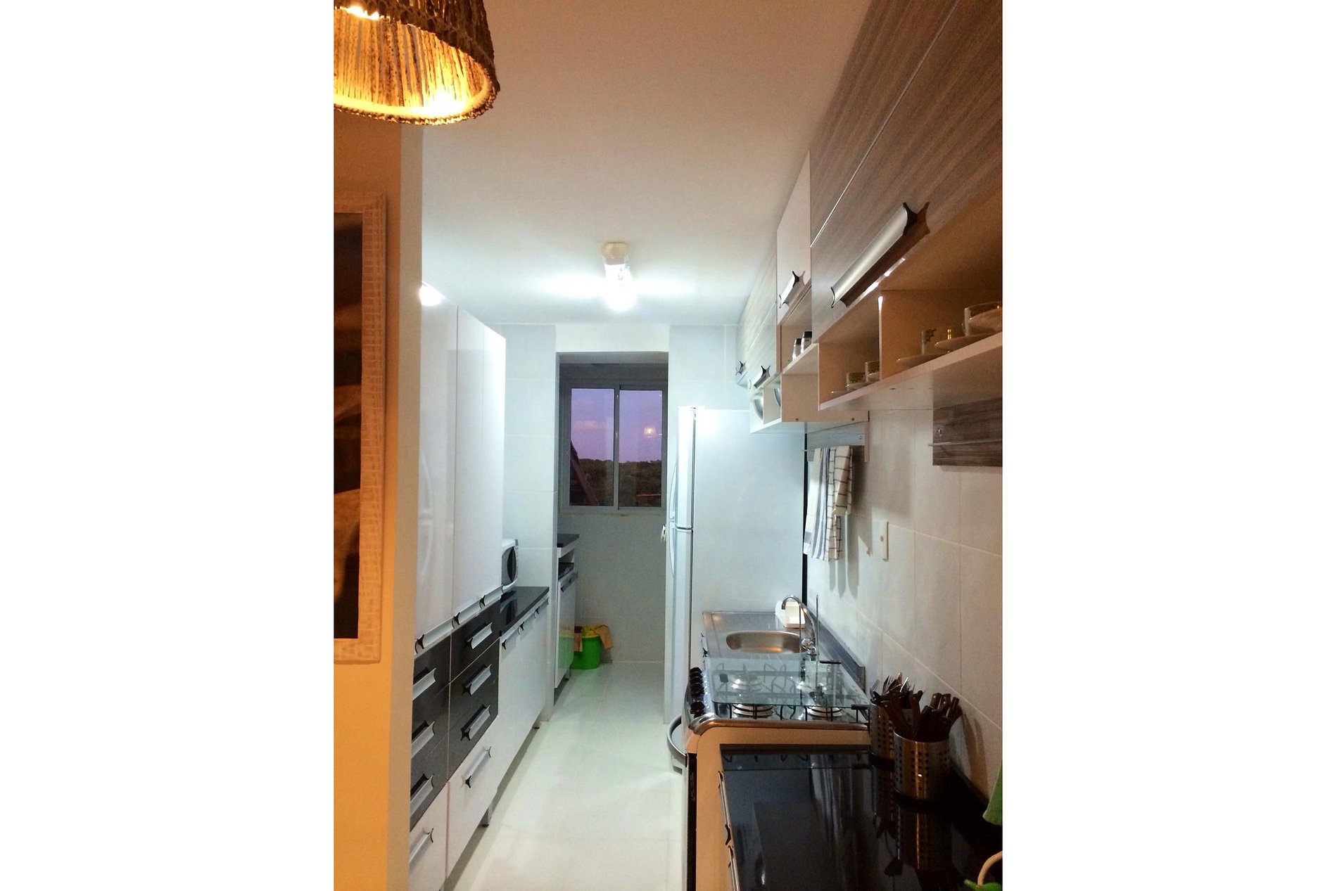 O espaço é muito bem decorado, prático e aconchegante, com uma ampla varanda gourmet muito atraente. A cozinha americana está equipada com todos os utensílios e eletrodomésticos, e tem uma pequena área de serviço com maquina lava-roupa. O apartamento é entregue com roupas de cama e banho.