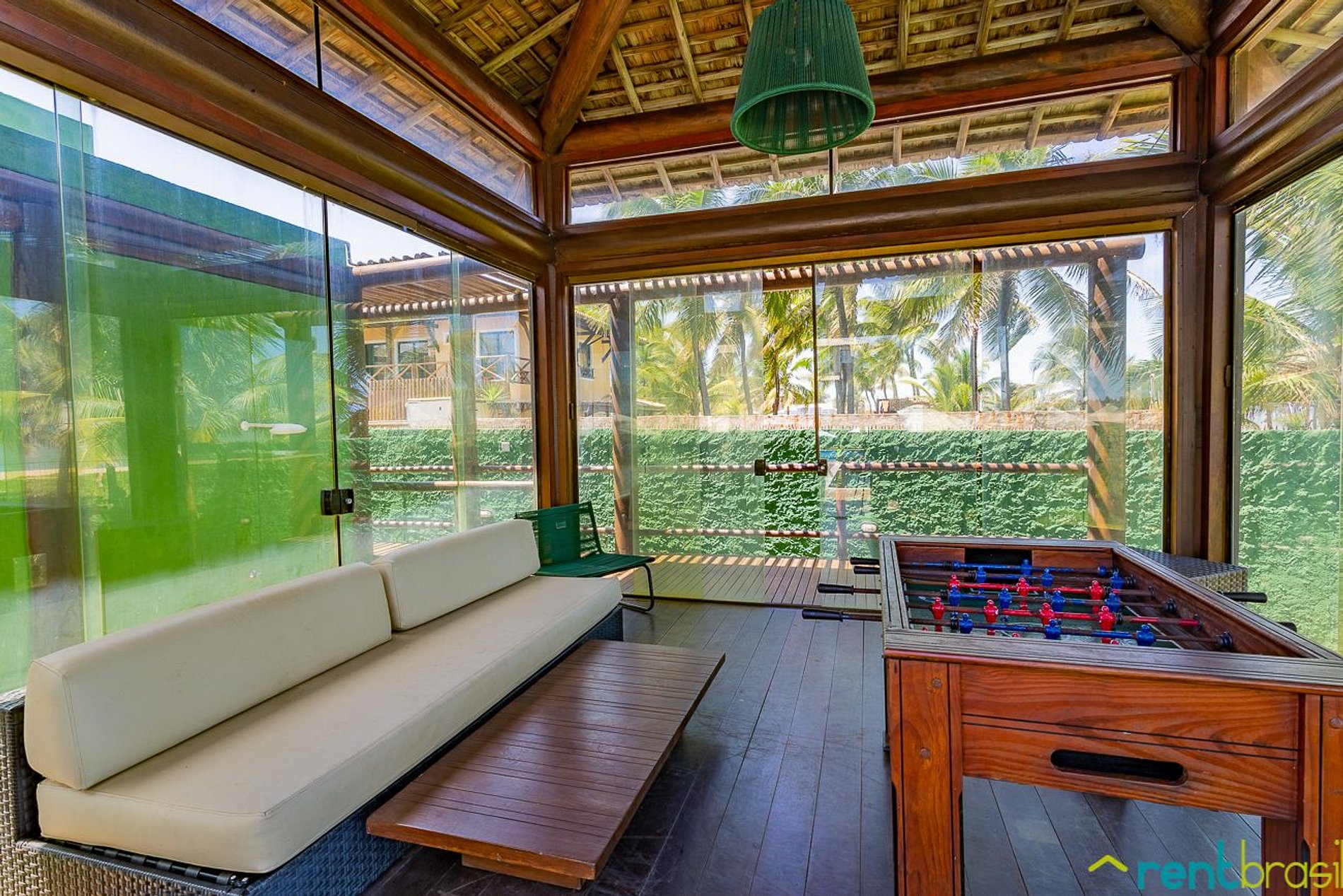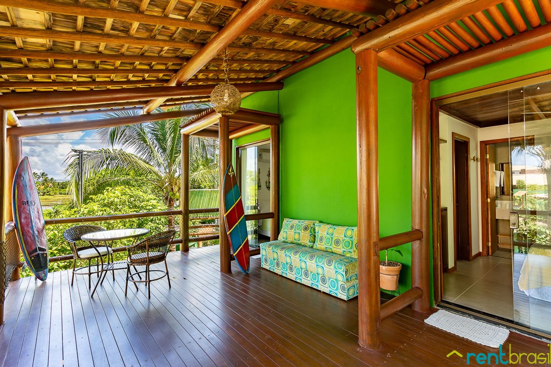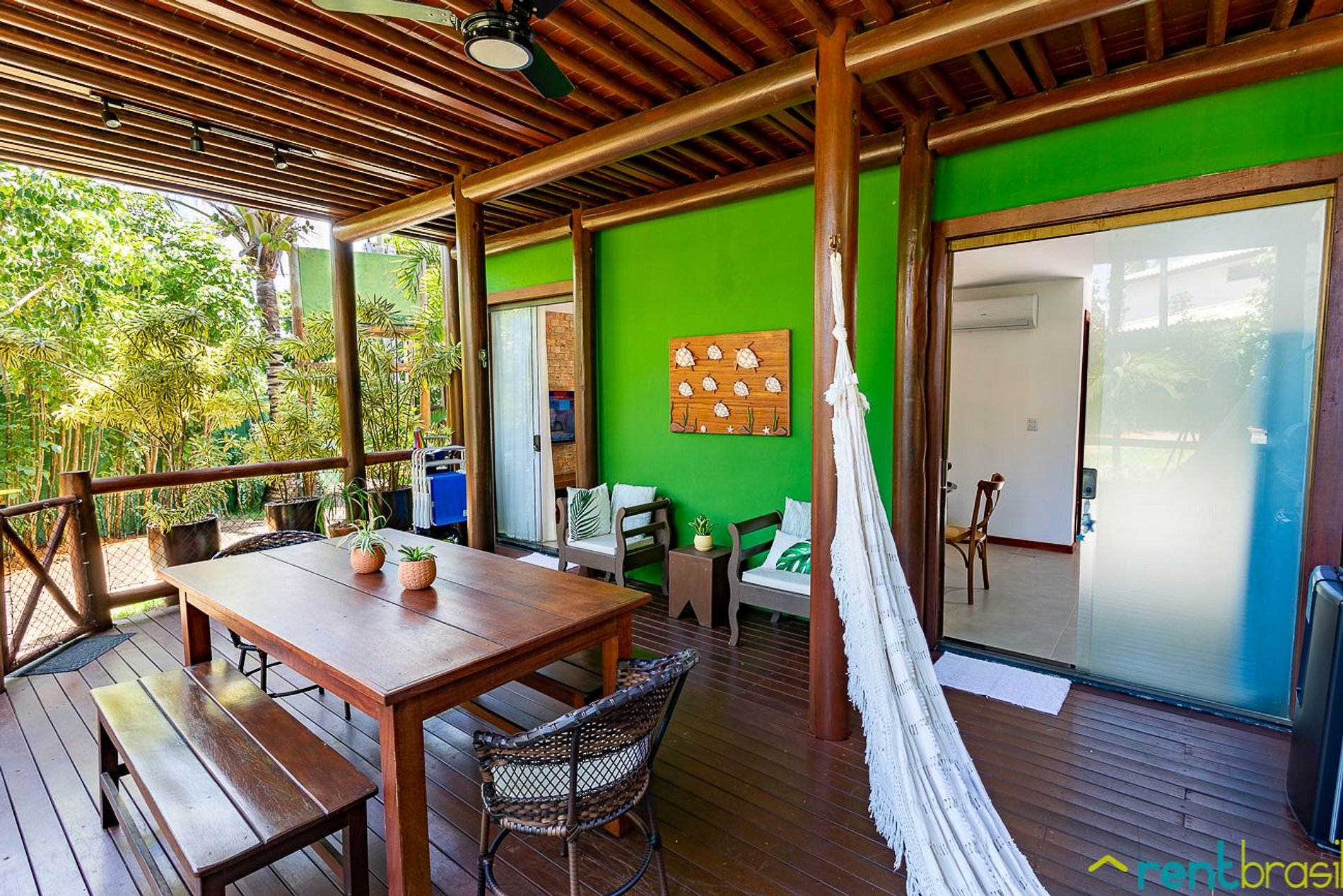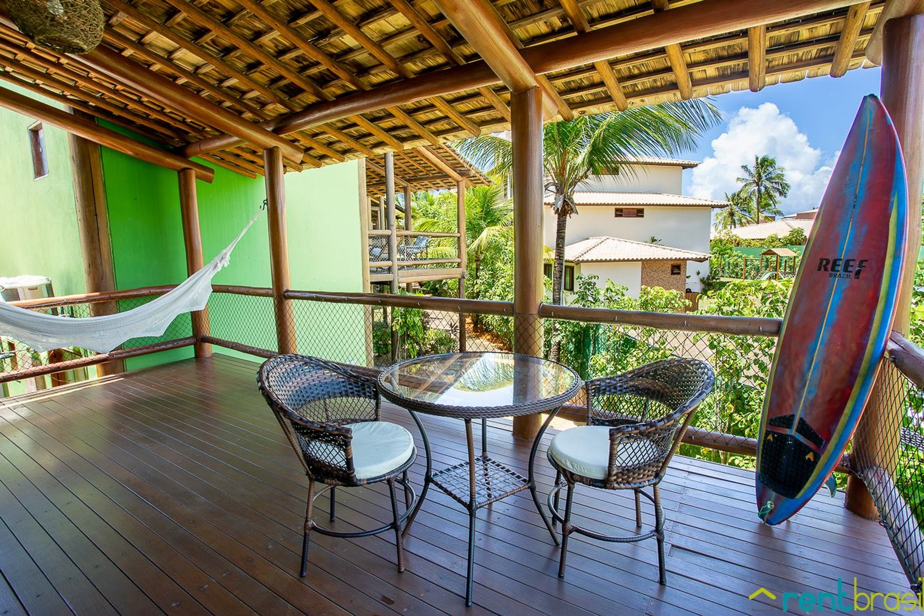 A entrada é feita pela varanda da casa, bem acessível e sem escadas. A varanda é bem ampla e oferece todo o conforto necessário, como: conjunto de mesa e cadeiras, poltronas, rede, churrasqueira e uma cervejeira para curtir os bons momentos.