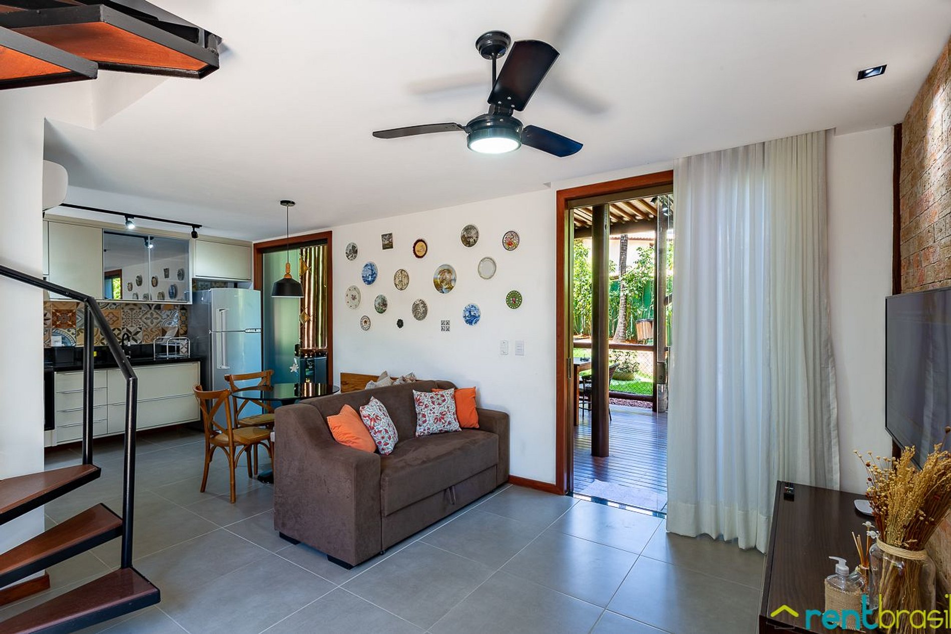 A Sala tem uma Smart TV (50") e o espaço é integrado com uma cozinha completa, lavabo e área de serviço com máquina de lavar roupa. A primeira suíte é no andar térreo. Existe também um pequeno pátio ao ar livre onde tem um chuveirão para se refrescar. No andar superior tem mais duas suítes de casal, com acesso a uma espaçosa varanda mobiliada com rede, jogo de mesa com cadeiras e sofá.