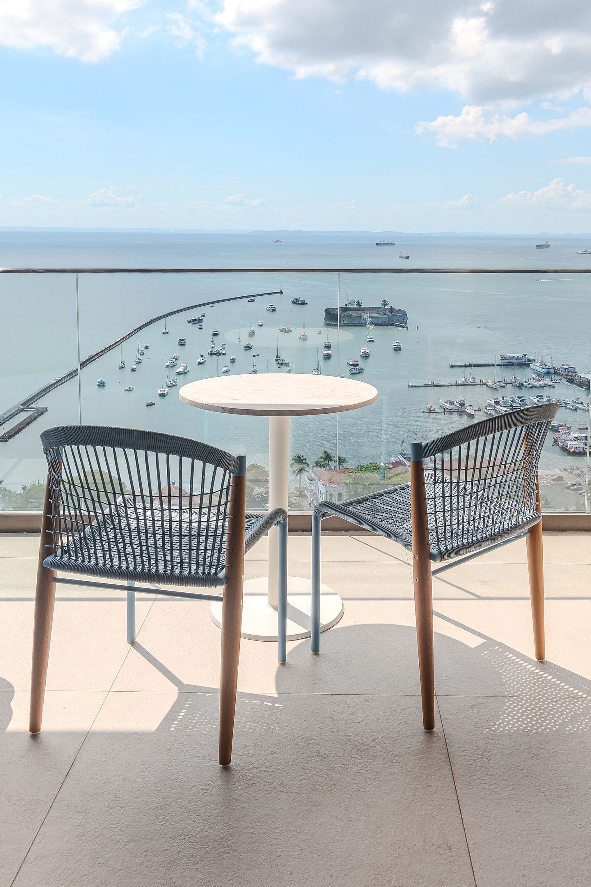 A vista da varanda para a Baía de Todos os Santos, que se estende de maneira acolhedora, completa essa experiência sensorial única.