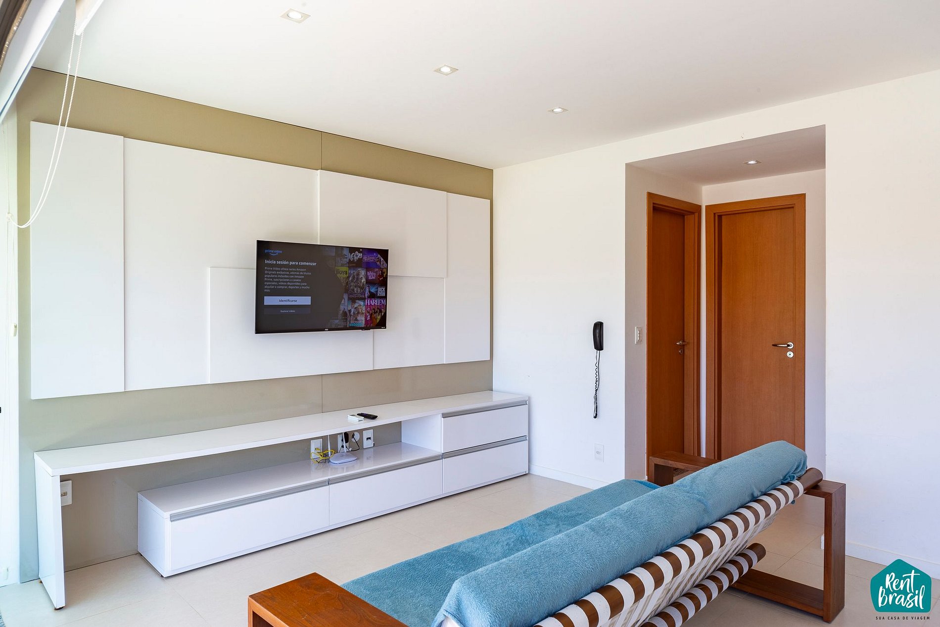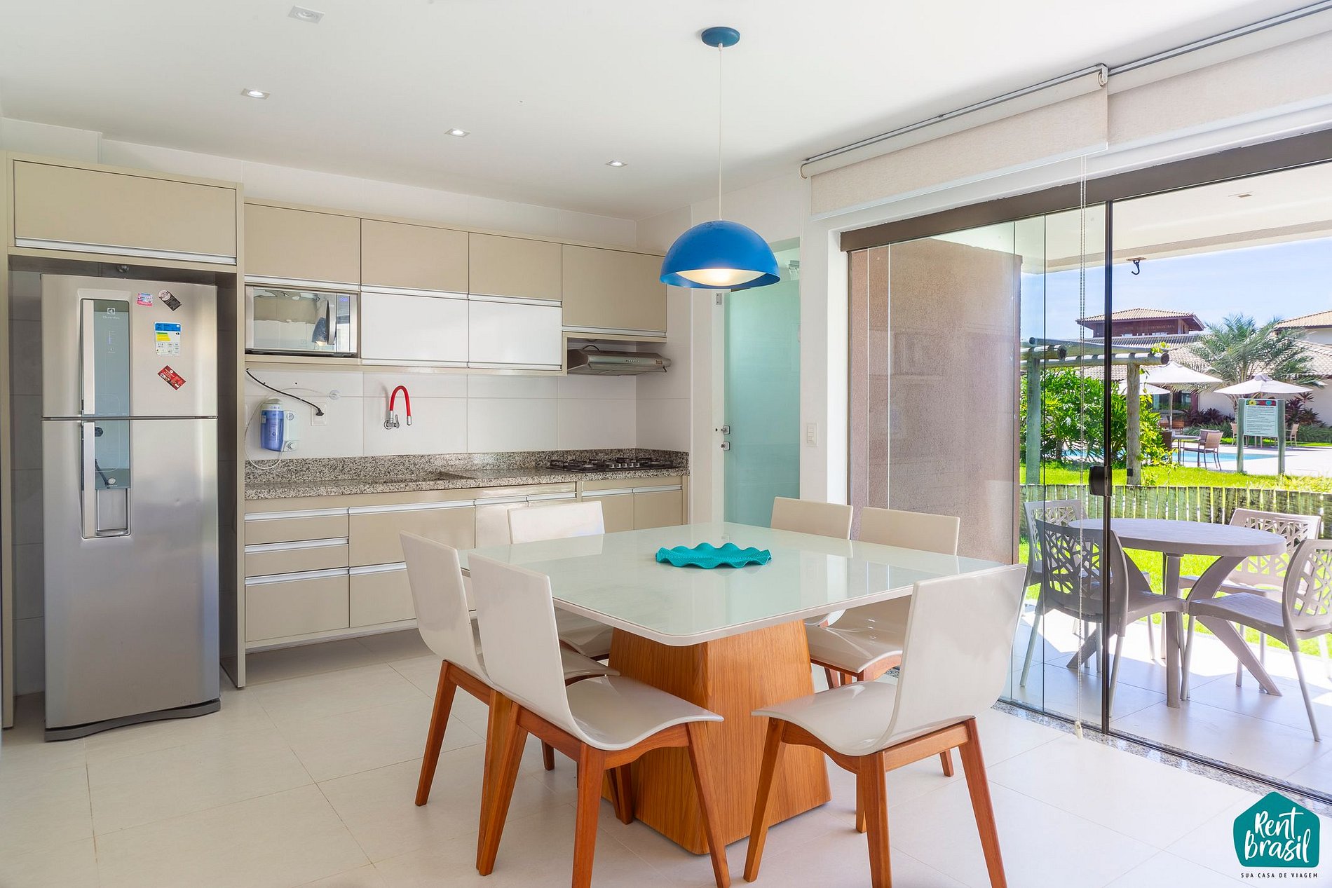 A sala de estar está integrada com a cozinha (ambas climatizadas) que conta com sofá, Smart Tv e um ambiente clean e acolhedor. A cozinha está completamente equipada com geladeira, fogão, forno, filtro de água, micro-ondas e utensílios. Na varanda é garantido um ambiente agradável com mesinha para reunir os amigos e a família, e poder se refrescar em um chuveirão após um banho de mar durante sua estada com a Rent Brasil.