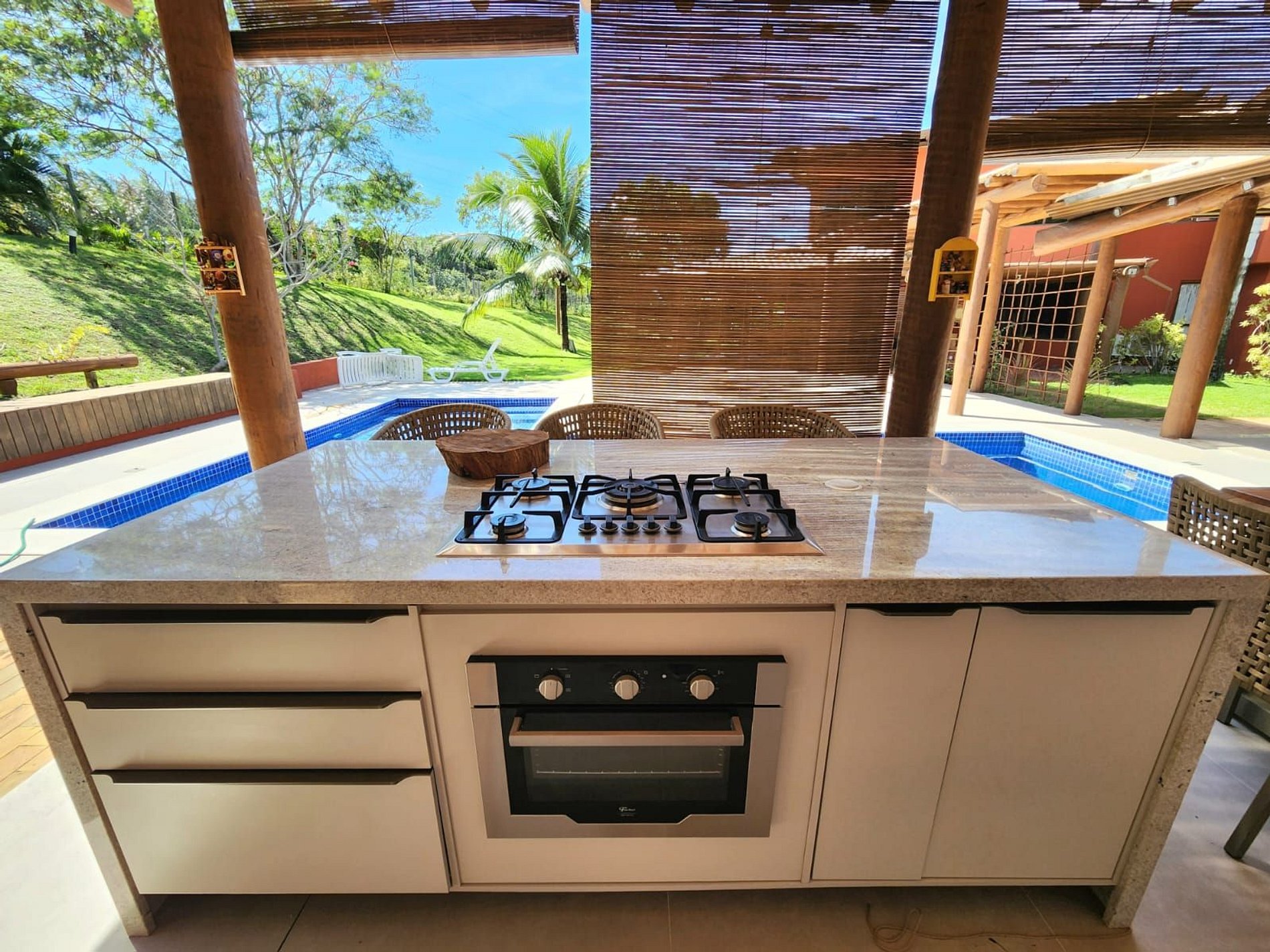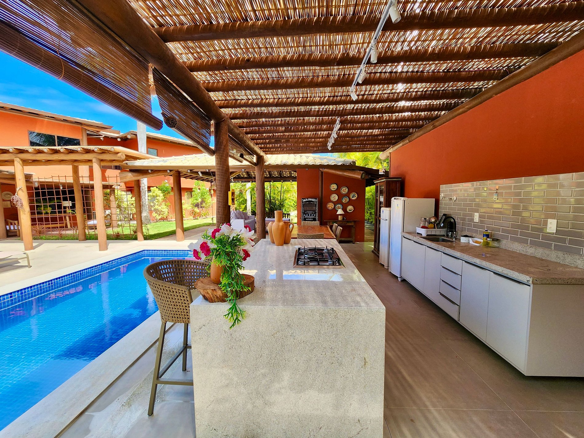 Além dessas comodidades, a área externa oferecida é excepcional! Contamos com um deck, uma maravilhosa piscina privativa equipada com espreguiçadeiras e guarda-sóis. Passando pelo maravilhoso Espaço Gourmet equipado com churrasqueira a gás, uma bancada com cooktop, geladeira e freezer, permitindo que você possa preparar refeições ao ar livre. E para completar, o lounge aconchegante com TV (50"), sofás confortáveis e uma caixa de música proporcionarão momentos de entretenimento e desconcentração.