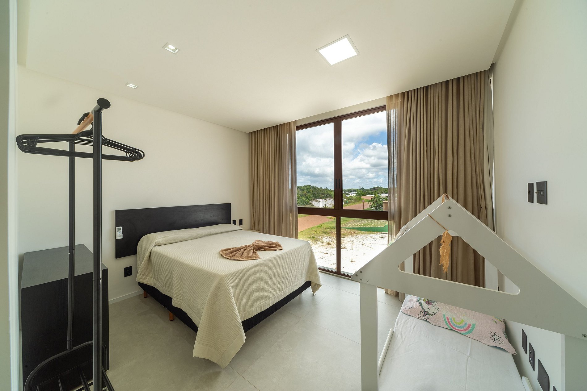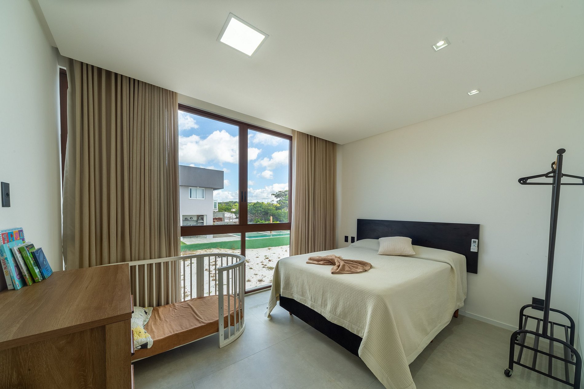 Está ubicada muy cerca del acceso a la playa. Ofrecemos un ambiente cómodo y acogedor, perfecto para disfrutar con amigos y familiares. La propiedad cuenta con 4 suites con aire acondicionado en la planta superior; la suite principal tiene Smart TV, la segunda suite tiene una cuna portátil, la tercera suite tiene una cama/casita para niños de hasta 4 años y la cuarta suite tiene una cuna de madera. La sala de estar tiene una hermosa vista al exterior y está integrada con la cocina estilo americano, totalmente equipada con estufa, refrigerador, microondas, lavavajillas, así como utensilios y electrodomésticos. También hay un cuarto de servicio con una cama individual (con aire acondicionado).