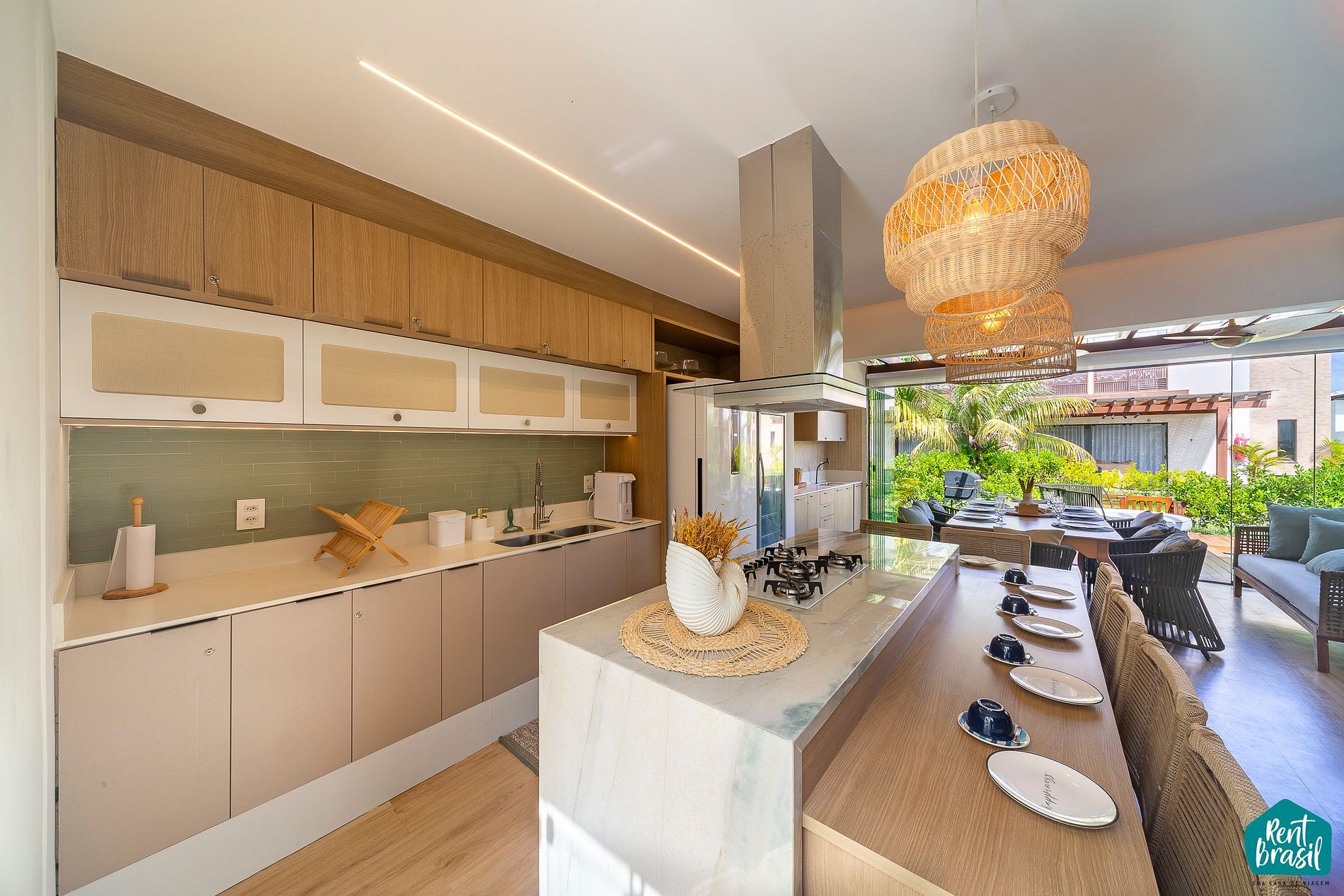 A varanda também é integrada com a sala e garante um ambiente arejado e confortável com mesa de jantar, máquina de gelo e churrasqueira para reunir os amigos e a família em seu aluguel por temporada. Tudo isso ao lado de uma piscina privativa para curtir ainda mais! Além disso temos disponível nesta unidade cadeira de praia e guarda-sol para sua comodidade! Existe, adicionalmente, uma área de serviço equipada com máquina de lavar roupa.
