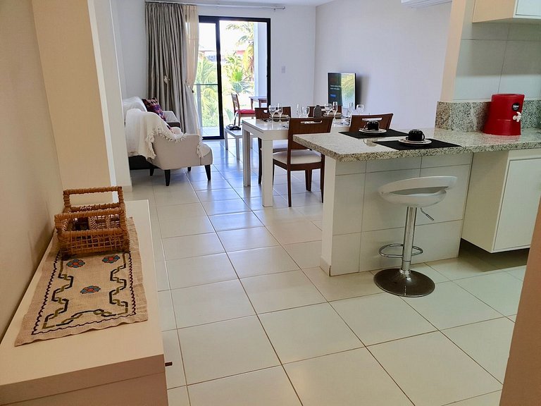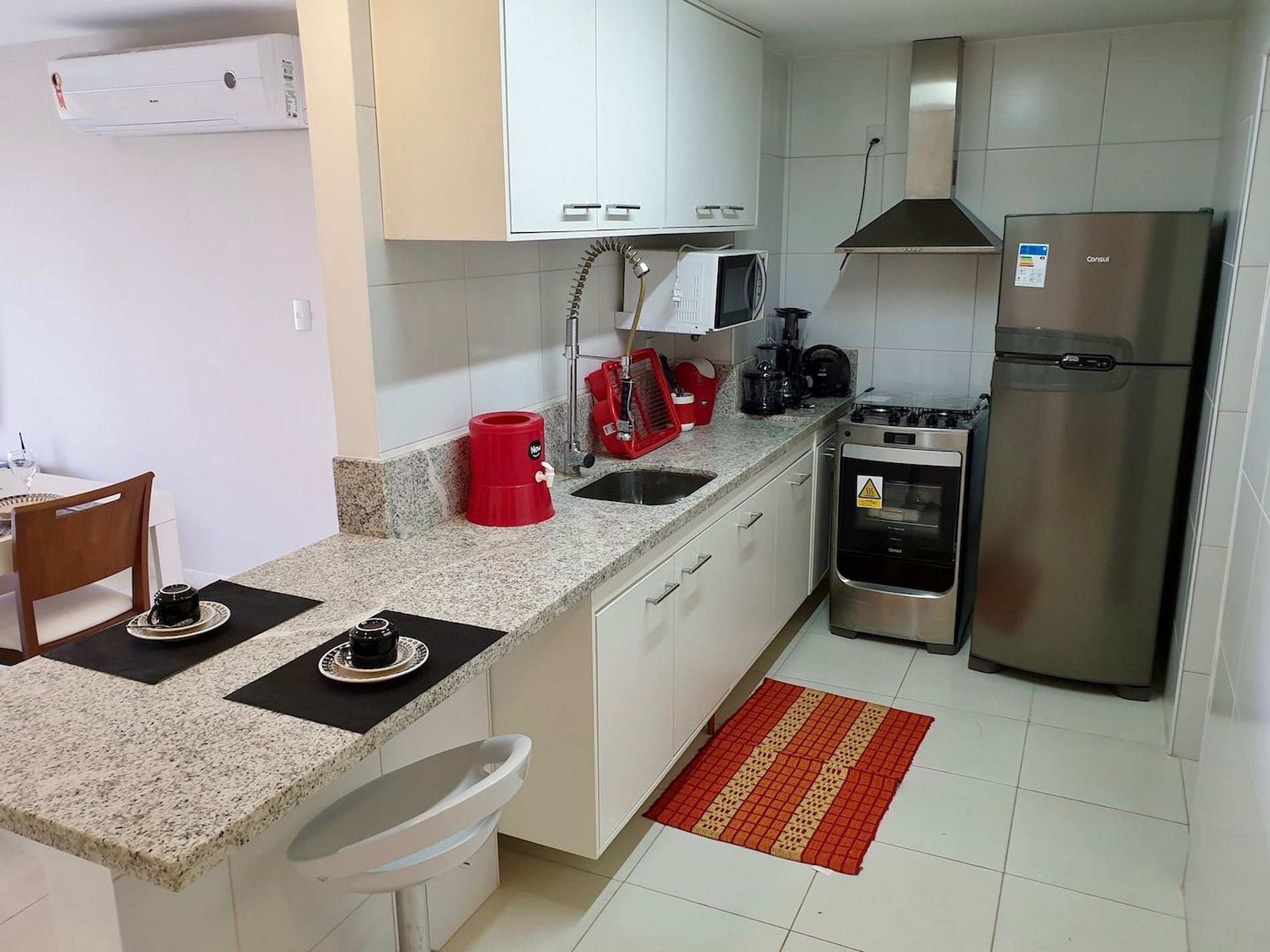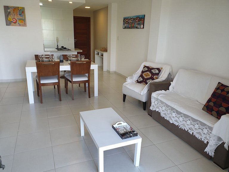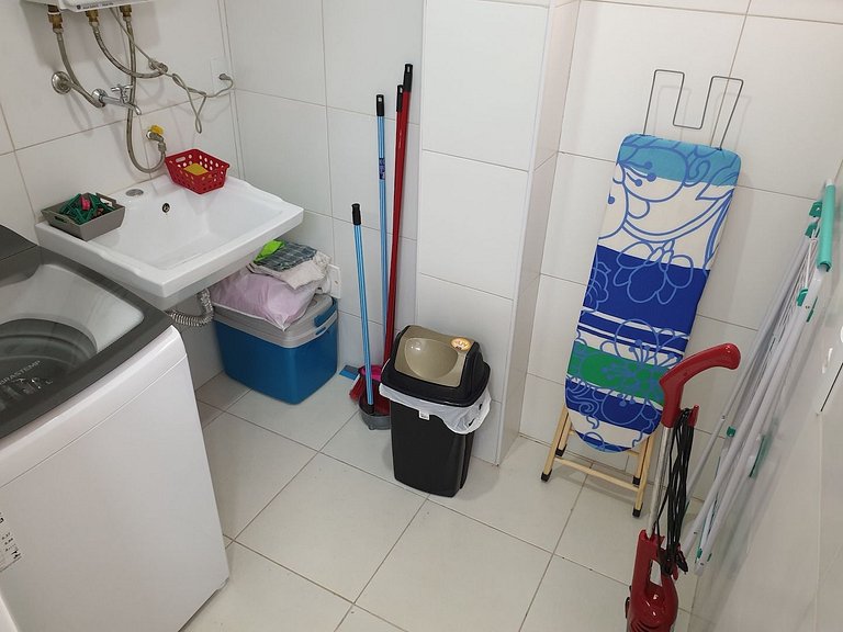 A sala de estar tem um confortável sofá-cama e Smart TV de 50". O espaço é compartilhado com uma cozinha americana totalmente mobiliada com espaço para as refeições, fogão, geladeira, além de utensílios e pequenos eletrodomésticos. Entre a sala e os quartos, tem um lavabo e uma área de serviço com os utensílios de limpeza e máquina de lavar roupa.
