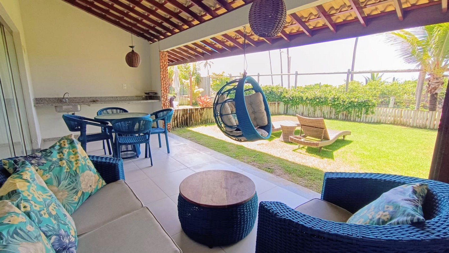 O jardim privativo é mobiliado e oferece uma agradável vista para o mar, com espaço para descanso e rede instalada. A unidade acomoda confortavelmente até seis pessoas.