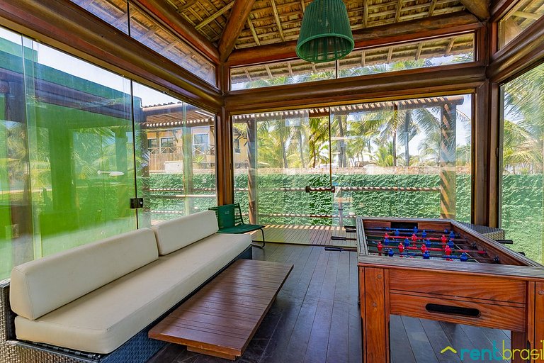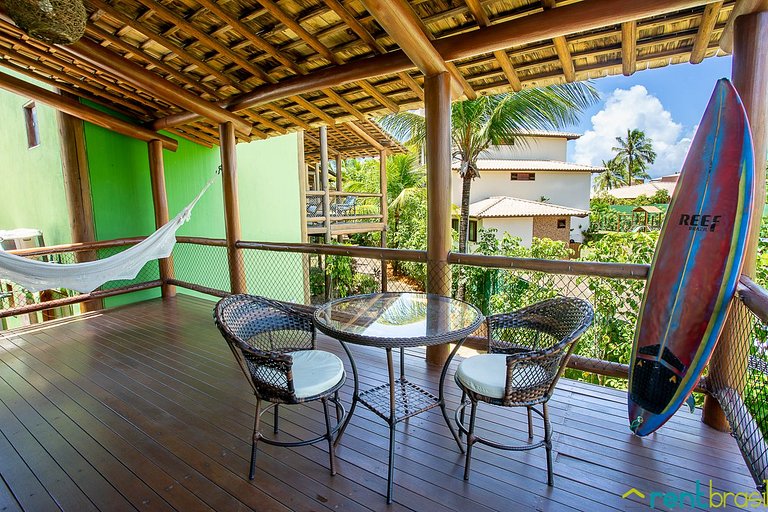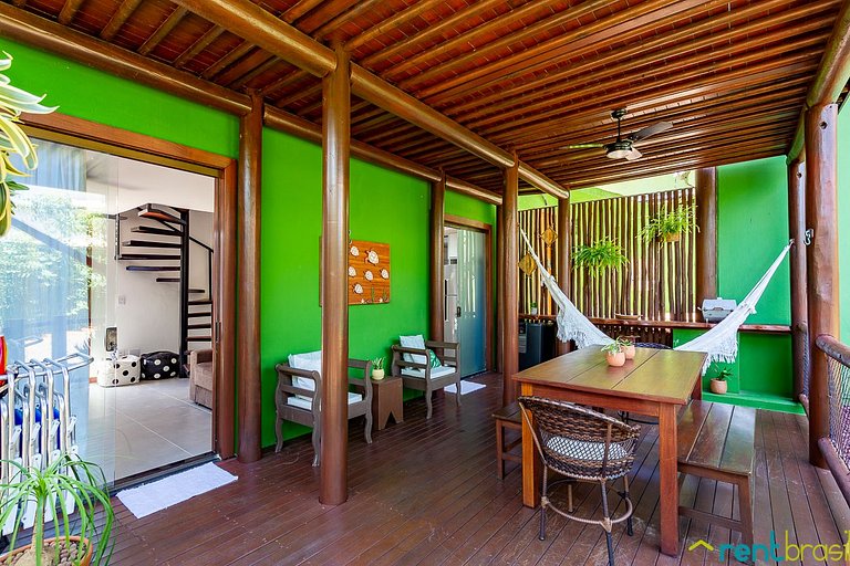 A Sala tem uma Smart TV (50") e o espaço é integrado com uma cozinha completa, lavabo e área de serviço com máquina de lavar roupa. A primeira suíte é no andar térreo. Existe também um pequeno pátio ao ar livre onde tem um chuveirão para se refrescar. No andar superior tem mais duas suítes de casal, com acesso a uma espaçosa varanda mobiliada com rede, jogo de mesa com cadeiras e sofá.