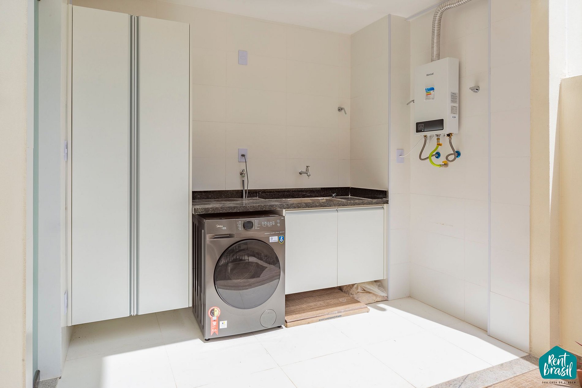 Na área externa é garantido um ambiente arejado e confortável com mesa de jantar, cervejeira e máquina de gelo para reunir os amigos e a família em seu aluguel por temporada. Existe, adicionalmente, uma área interna com chuveiro, mesa além de estar equipada com lava e seca.