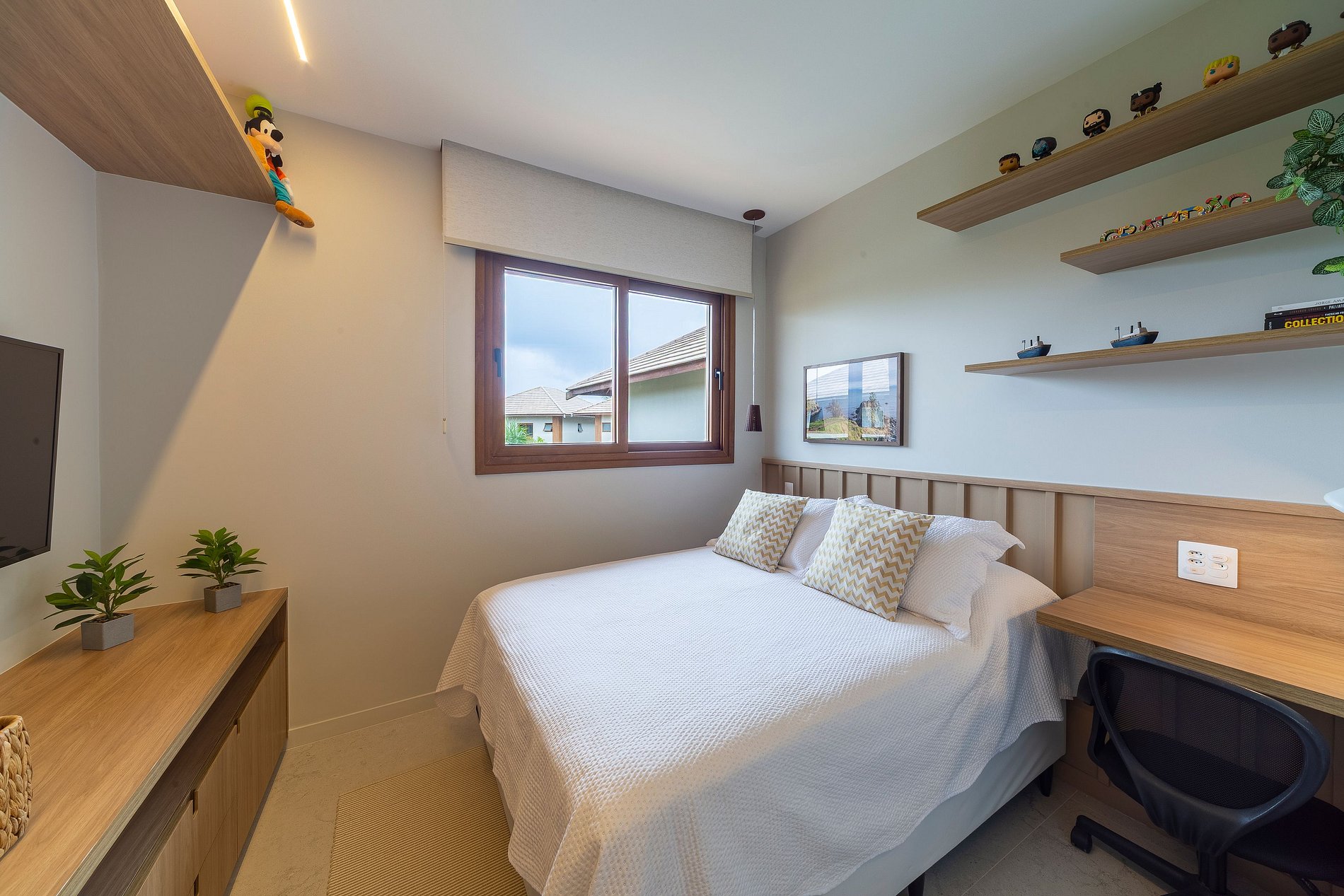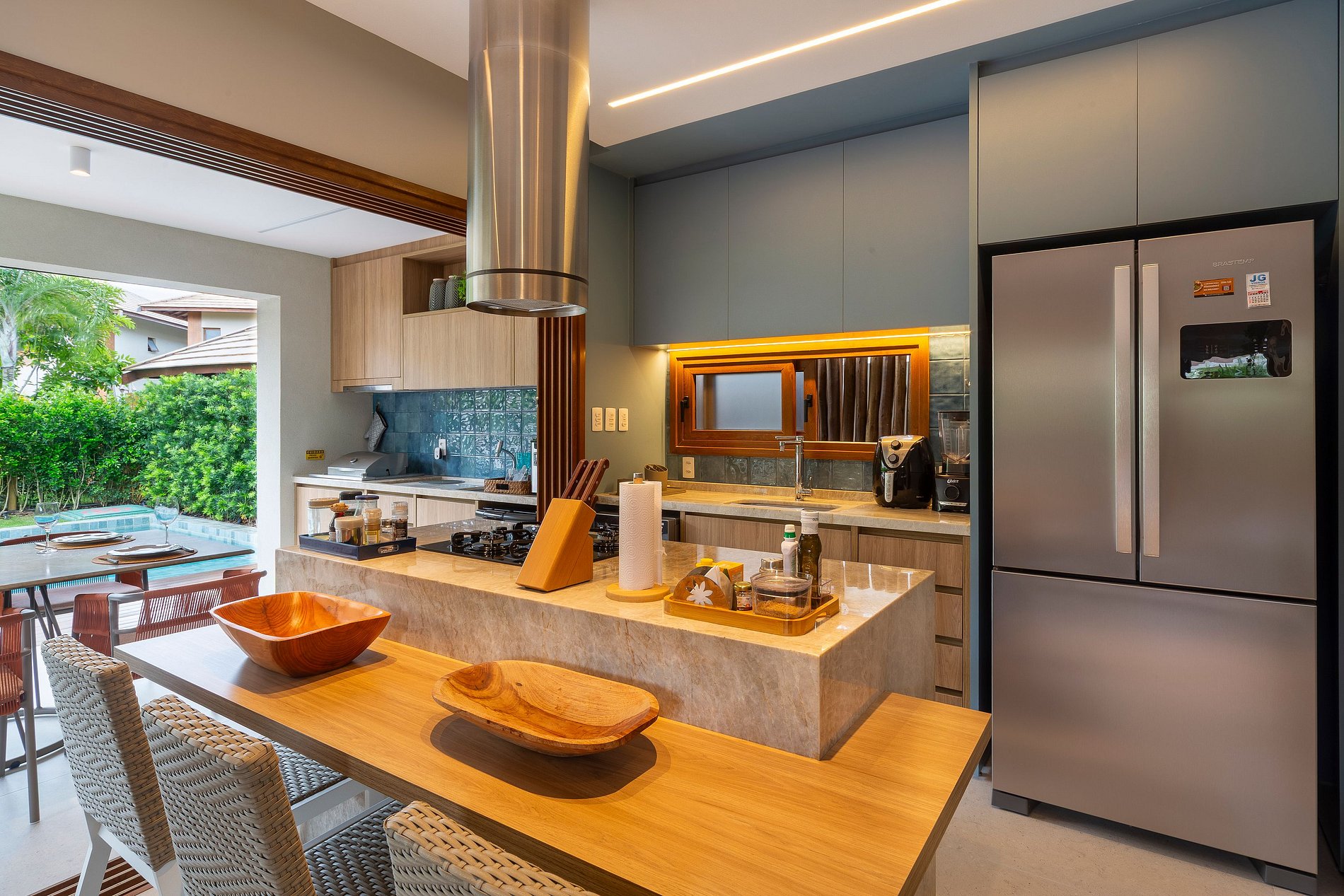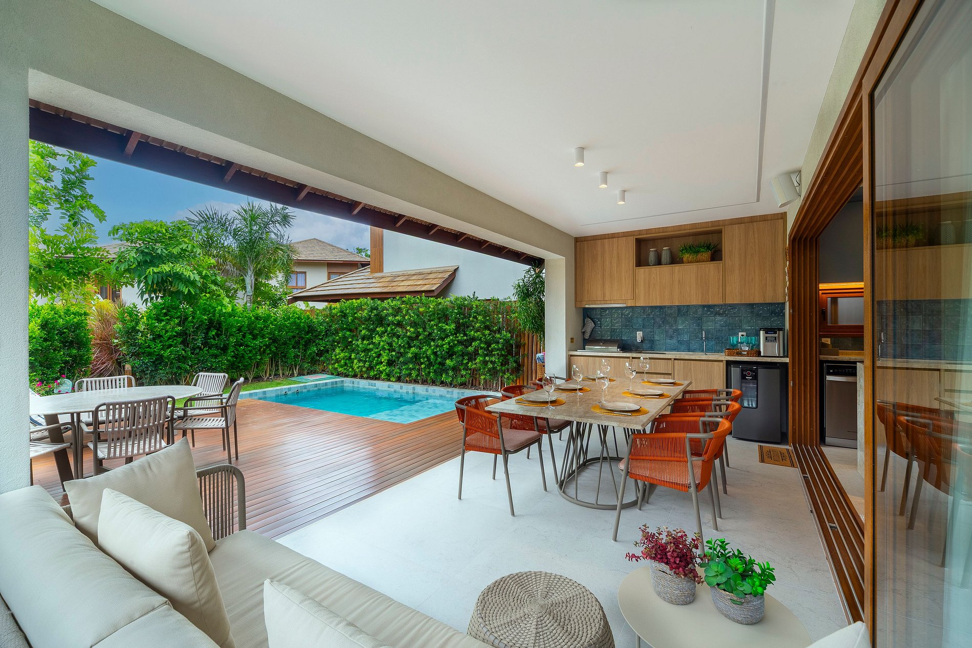 3 suítes climatizadas proporcionando uma melhor noite de sono, sendo uma no térreo e as demais no andar superior. Uma delas conta com uma cama auxiliar; sala de estar com Smart TV e o espaço é integrado com uma cozinha completa, com ilha de granito de apoio, armários, e com equipamentos de primeira linha: Air fryer, fogão, geladeira e utensílios; o andar térreo conta ainda com um lavabo; a varanda oferece todo o conforto necessário, como conjunto de mesa, cadeiras e espreguiçadeiras; o Bangalô ainda possui churrasqueira e cervejeira, para curtir os bons momentos, além de deck de piscina privativa, ampliado de madeira, e sem escadas; área de serviço para sua comodidade.