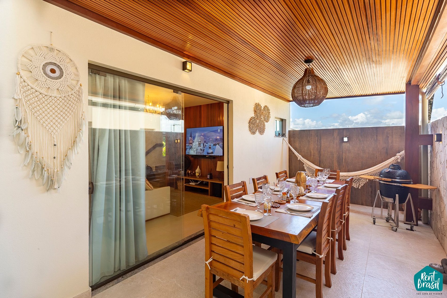 Na varanda com vista para o mar é garantido um ambiente arejado e confortável com mesa de jantar, sofá, um chuveirão e churrasqueira para reunir os amigos e a família em seu aluguel por temporada. Existe, adicionalmente, uma área interna com sofá, mesa com assentos e uma rede para os descansos nos fins de tarde. Há também uma área de serviço com máquina de lavar. Acomodamos confortavelmente até 6 pessoas.