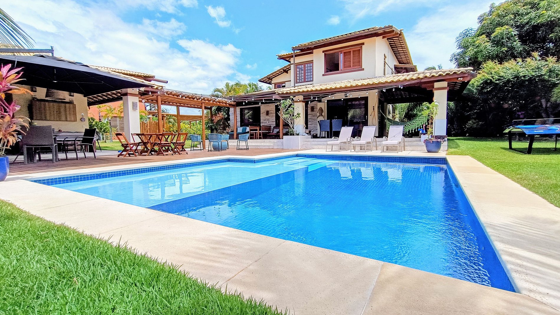 A nossa casa está localizada no Condomínio Alto das Bromélias, dentro do Complexo Turístico Reserva Imbassaí. O condomínio oferece segurança 24 horas, acesso privativo à praia, um centro de fitness, quadras poliesportivas, um clube com piscina e áreas de lazer.