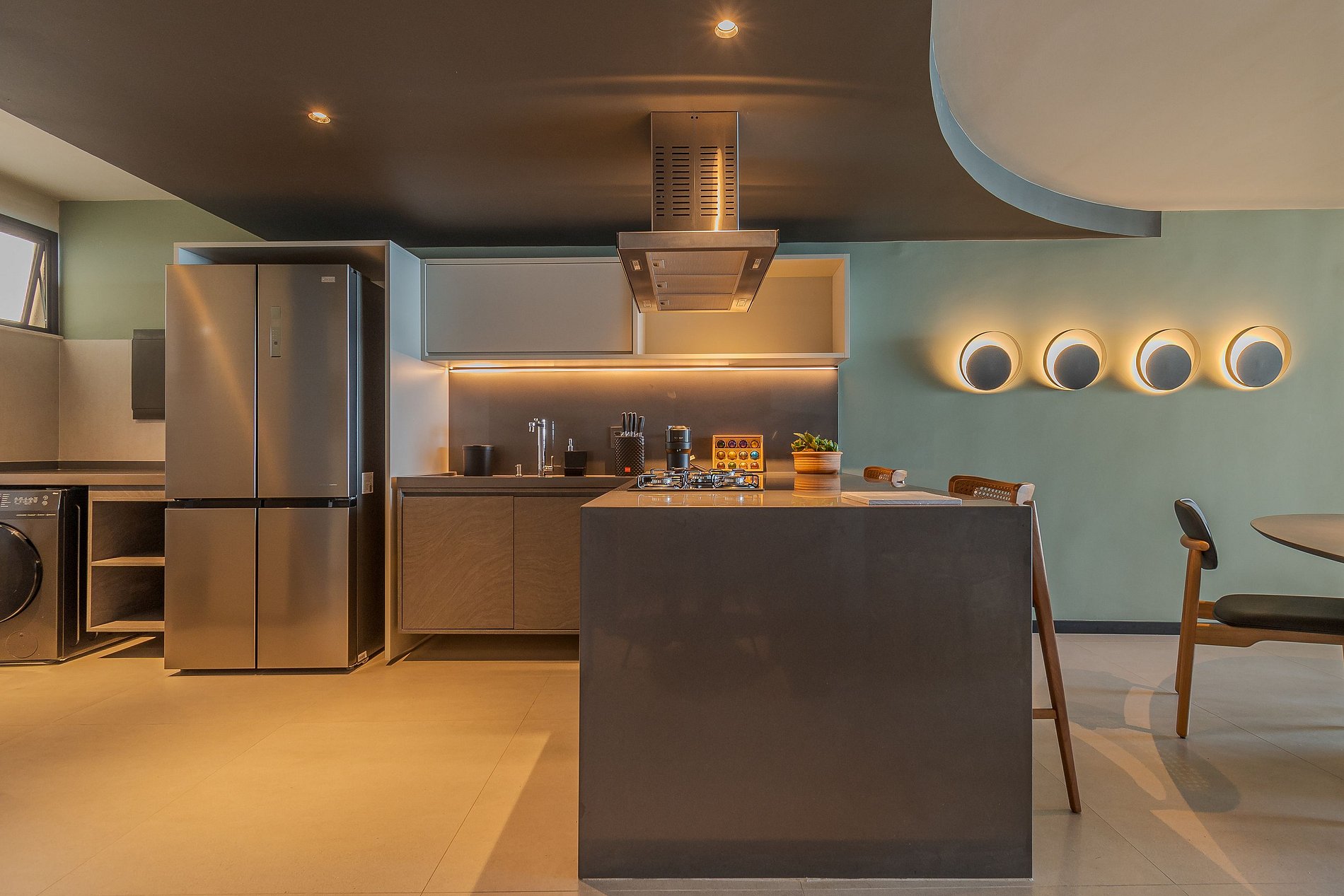 Com 02 quartos, o apartamento pensado pela arquiteta Viviane Vieira é climatizado e conta com enxoval completo, sala de estar e jantar, lavabo e cozinha equipada com utensílios e eletrodomésticos que facilitam o seu dia-a-dia. o ambiente é um verdadeiro tributo à produção artística local. O apartamento tem tons verdes que acolhem fotografias em quadros que retratam o artesanato em argila e a modernidade de um ambiente automatizado desenvolvido para ser totalmente funcional. A vista da varanda para a Baía de Todos os Santos, que se estende de maneira acolhedora, completa essa experiência sensorial única.