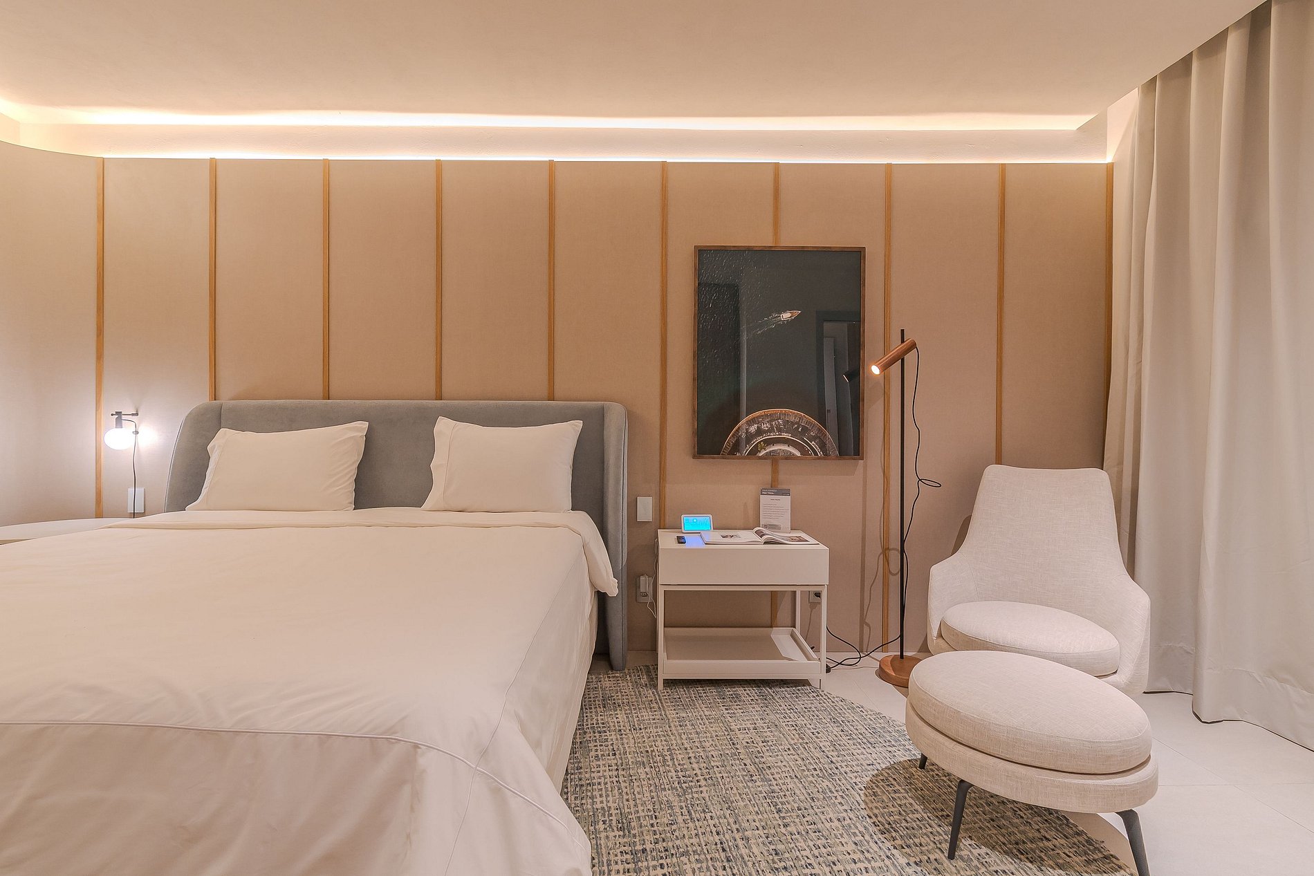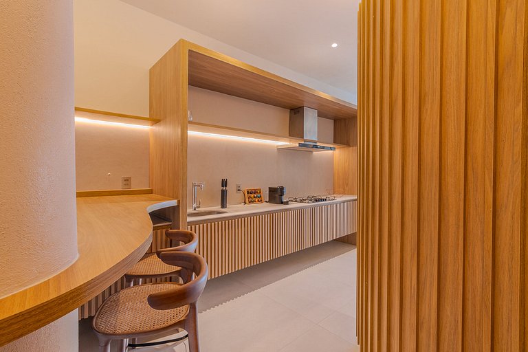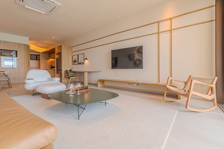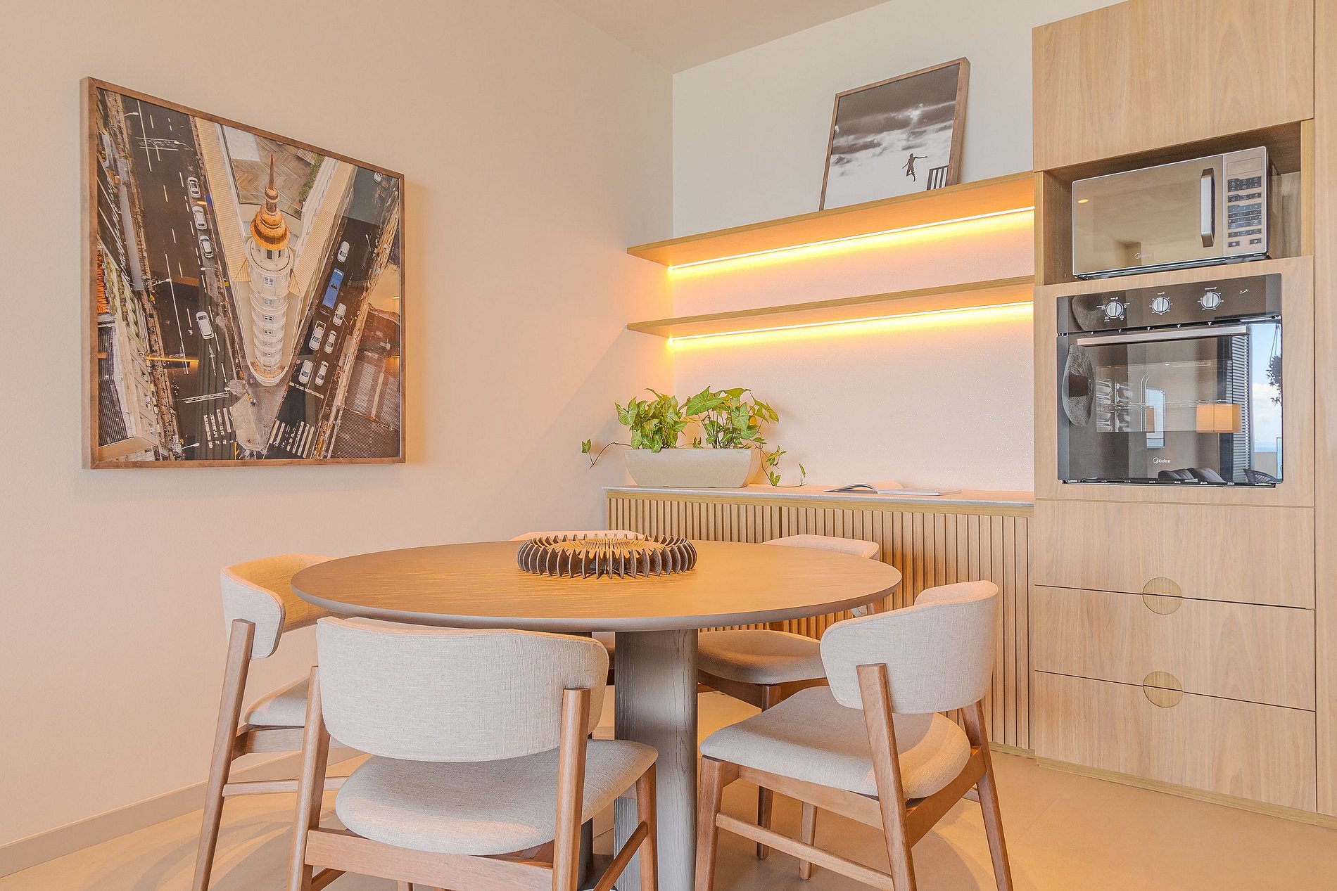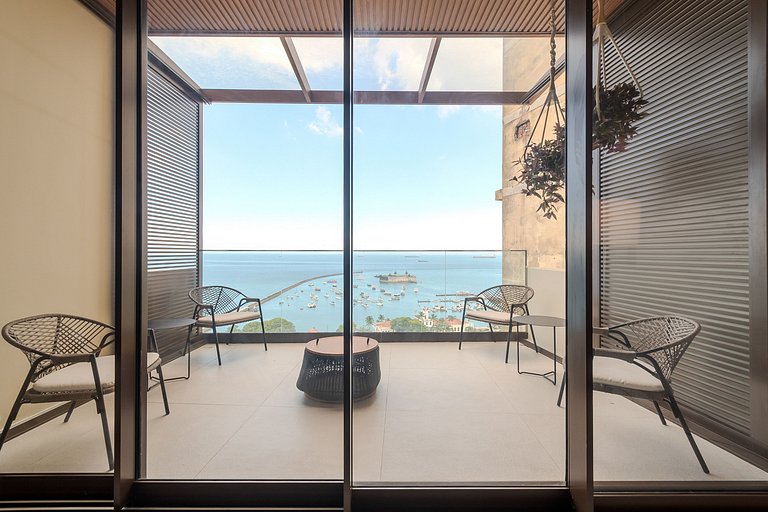 Com 01 suíte, o apartamento pensado pelas arquitetas Erla Ribeiro e Gabriela Gianotti é climatizado e conta com enxoval completo, sala de estar e jantar, lavabo e cozinha equipada com utensílios e eletrodomésticos que facilitam o seu dia-a-dia. o ambiente é um verdadeiro tributo à produção artística local. O apartamento tem tons em cores quentes e frias que contrastam com a mobília e decoração inspirada na Bahia. A vista da varanda para a Baía de Todos os Santos, que se estende de maneira acolhedora, completa essa experiência sensorial única.