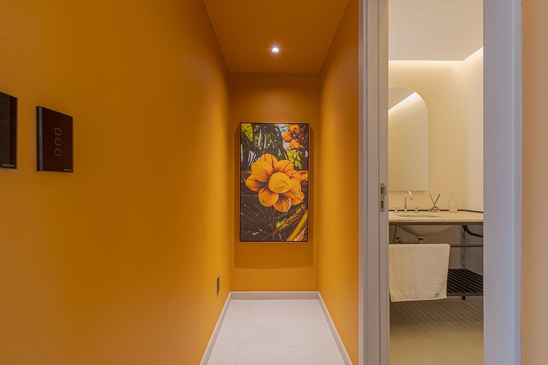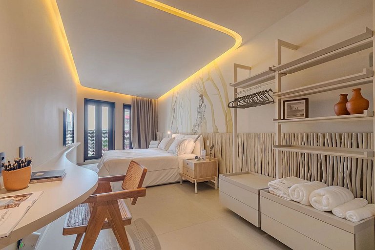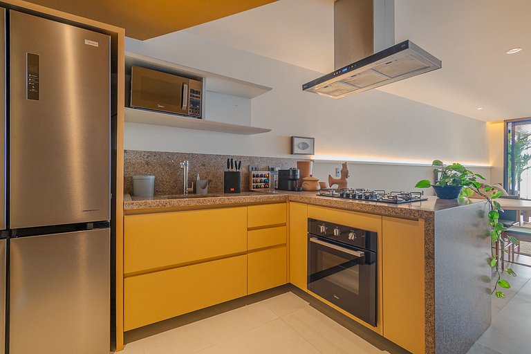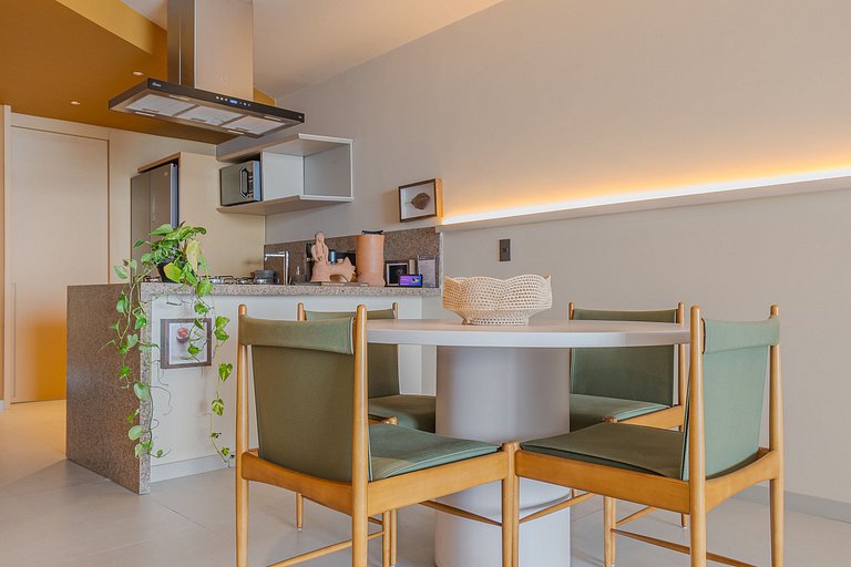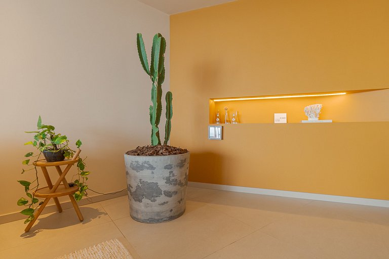 Com 02 quartos, o apartamento pensado pelo arquiteto Gabriel Magalhães é climatizado e conta com enxoval completo, sala de estar e jantar, lavabo e cozinha equipada com utensílios e eletrodomésticos que facilitam o seu dia-a-dia. o ambiente é um verdadeiro tributo à produção artística local. Nas paredes a cultura indígena e afro brasileira é retratada em tons de marrom e amarelo que contrastam com pintura e fotografias tropicais. A vista da varanda para a Baía de Todos os Santos, que se estende de maneira acolhedora, completa essa experiência sensorial única.