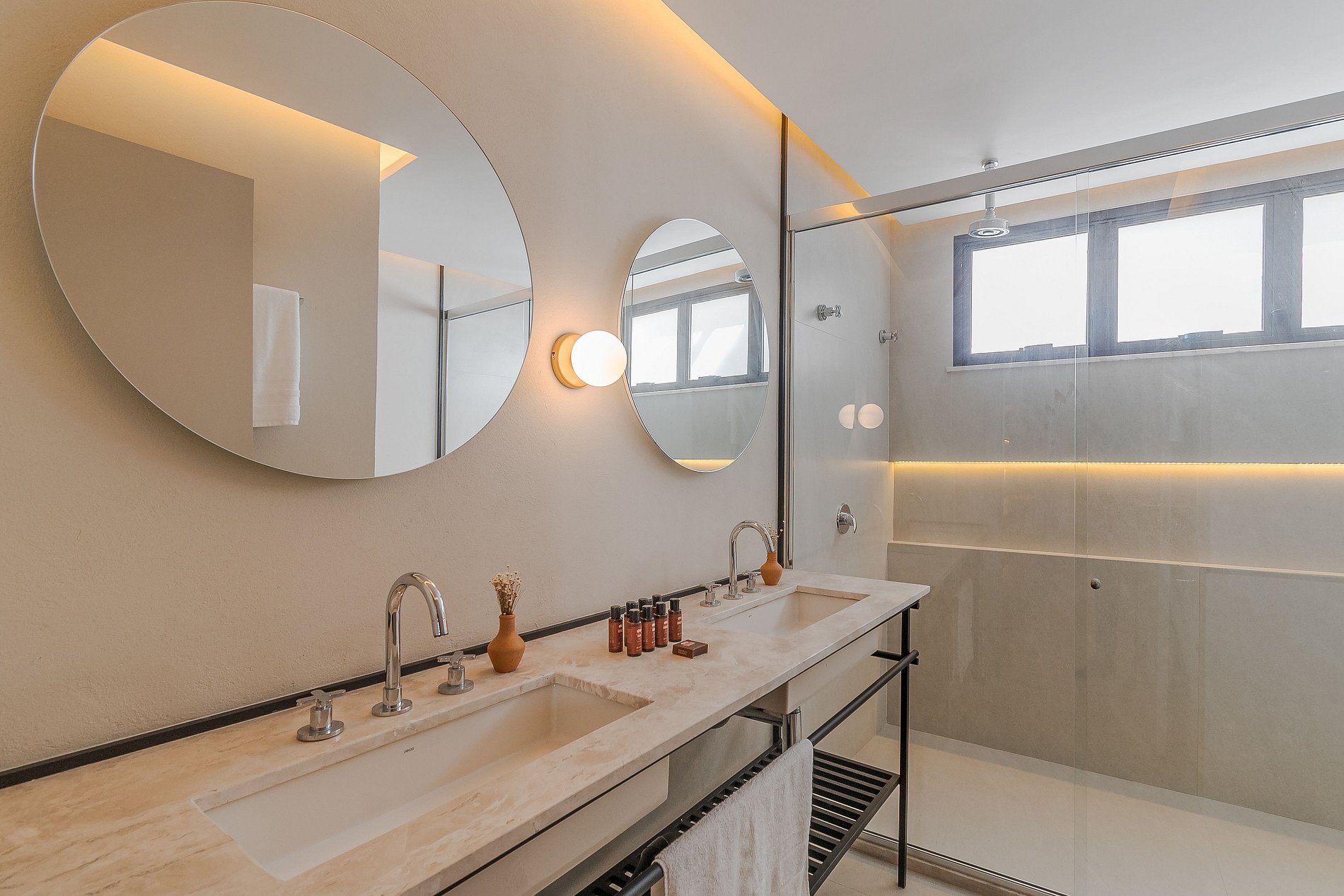 Com 01 suíte dupla, o apartamento pensado pela arquiteta Natália Velame é climatizado e conta com enxoval completo, sala de estar e jantar, lavabo e cozinha equipada com utensílios e eletrodomésticos que facilitam o seu dia-a-dia. O ambiente é um verdadeiro tributo à produção artística local. O requintado apartamento está repleto de sofisticação e tecnologia, os tons de dourado e rosé te leva a imersão total ao conforto e experiência 5 estrelas, isso porquê além da maravilhosa vista da Baía de Todos os Santos, a suíte conta com banheira, cervejeira, espaço office e cama king size!