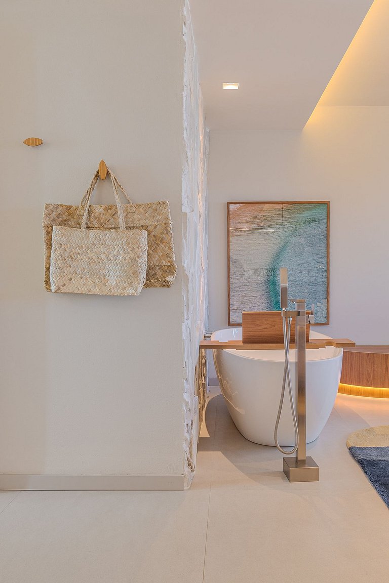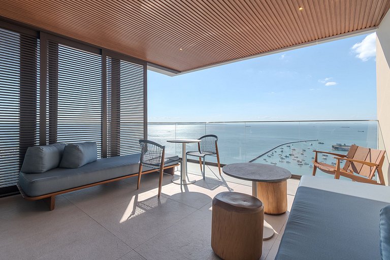 A vista da varanda para a Baía de Todos os Santos, que se estende de maneira acolhedora, completa essa experiência sensorial única.