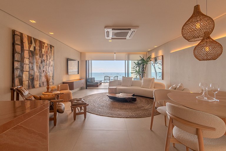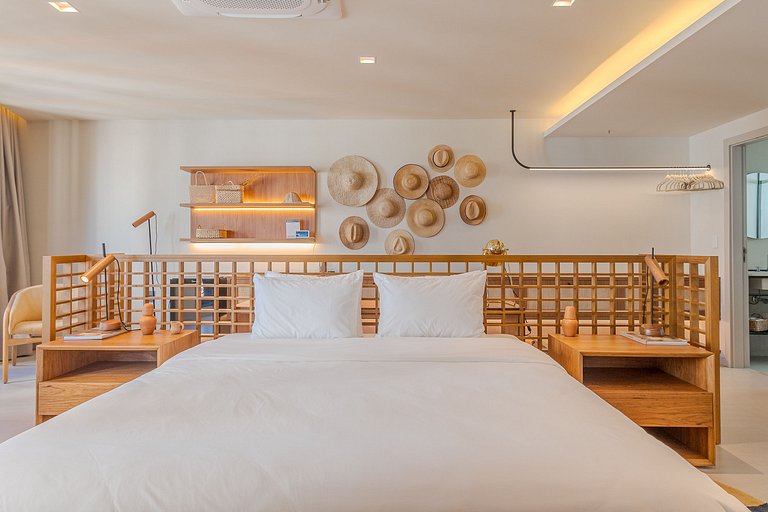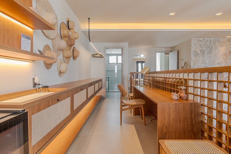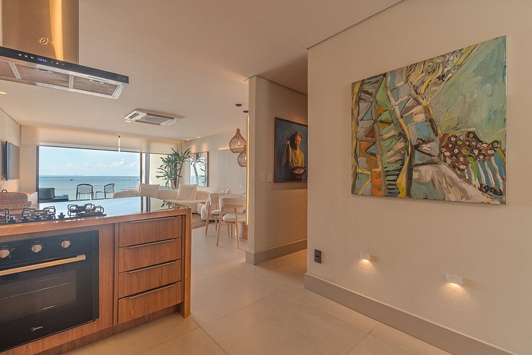 Com 01 suíte dupla, o apartamento pensado pela arquiteta Natália Velame é climatizado e conta com enxoval completo, sala de estar e jantar, lavabo e cozinha equipada com utensílios e eletrodomésticos que facilitam o seu dia-a-dia. O ambiente é um verdadeiro tributo à produção artística local. O requintado apartamento está repleto de sofisticação e tecnologia, os tons de dourado e rosé te leva a imersão total ao conforto e experiência 5 estrelas, isso porquê além da maravilhosa vista da Baía de Todos os Santos, a suíte conta com banheira, cervejeira, espaço office e cama king size!