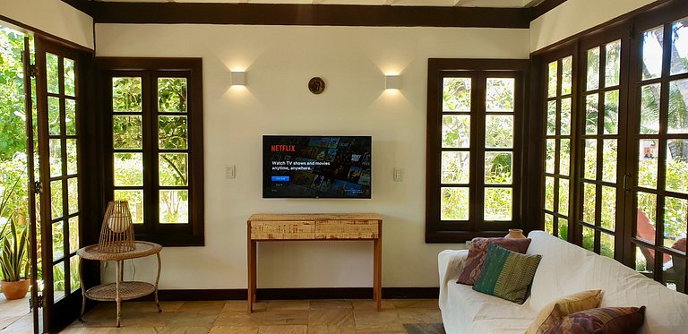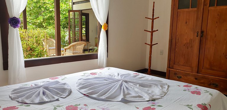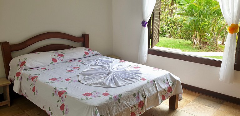 A casa é composta por uma suíte principal no primeiro andar, com cama de casal, Smart TV e acesso a uma varanda privativa com vista para o jardim. No andar térreo há mais uma suíte com saída para o jardim, com uma cama de casal e uma cama de solteiro. No corredor temos um banheiro completo a disposição da casa e um terceiro quarto com cama de casal. Todos os quartos são climatizados, com vista para o jardim.