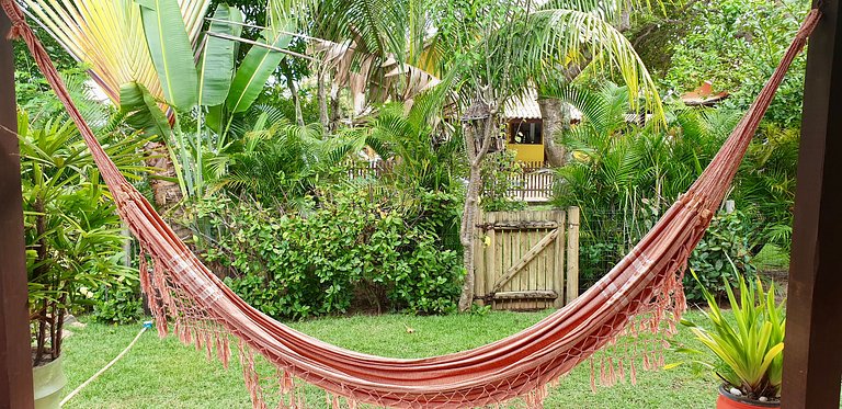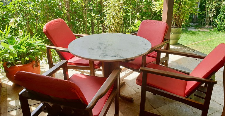 Na área externa temos duas varandas bem agradáveis, com mesas, cadeiras, poltronas e rede; atendendo muito bem a toda a família. Logo na entrada, o jardim envolve toda a casa até o fundo do terreno onde temos o acesso para a alameda do condomínio.