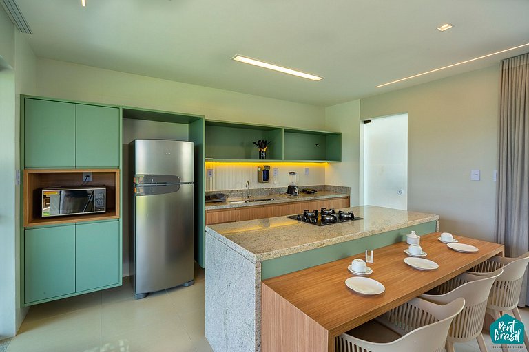 Na varanda é garantido um ambiente arejado e confortável com mesa de jantar e churrasqueira para reunir os amigos e a família em seu aluguel por temporada. Existe, adicionalmente, uma área interna com sofá e poltronas para os descansos nos fins de tarde. Há também uma área de serviço. Acomodamos confortavelmente até 6 pessoas.