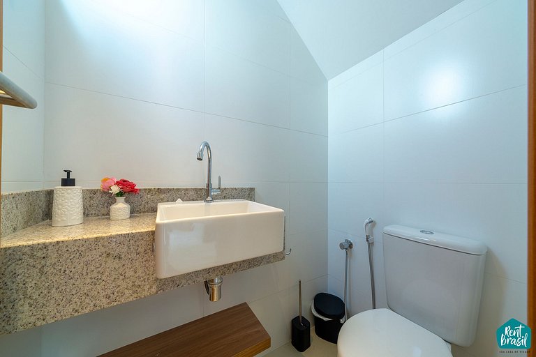 Oferecemos um ambiente confortável, aconchegante, perfeito para desfrutar com amigos e familiares. O imóvel dispõe de 2 suítes climatizadas no andar superior sendo a suíte principal com cama de casal e a segunda suíte com duas camas solteiro, mais uma auxiliar. No andar térreo há um lavabo e sala de estar com Smart Tv e sofá cama. Cozinha integrada completamente equipada com eletrodomésticos para facilitar sua estada: micro-ondas, forno, fogão, geladeira, além de filtro de água e utensílios.