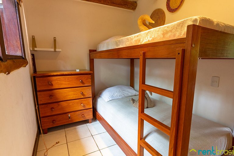 Conta com 4 quartos climatizados, sendo no andar térreo uma suíte dupla (beliche) e um quarto duplo (cama de casal) com varanda. No primeiro andar temos os outros dois quartos duplos, um com cama de casal e outro com duas camas de solteiro. Um banheiro social completo no térreo e outro no primeiro andar que atende os quartos de forma compartilhada.