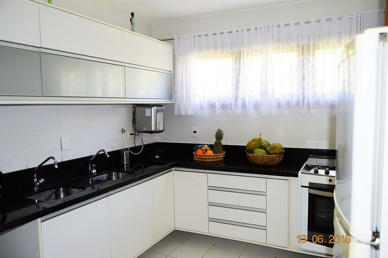Bem-vindo à nossa casa de alto padrão, térrea B02 Orquídeas! Oferecemos um ambiente confortável, aconchegante, perfeito para desfrutar com amigos e familiares. O imóvel dispõe de 4 suítes climatizadas, uma espaçosa sala de estar e jantar climatizadas com Smart TV. A cozinha está completamente equipada com fogão, geladeira, micro-ondas, uma lava-louças além de utensílios e eletrodomésticos. Há também uma área de serviço com máquina de lavar roupa e uma dependência de empregada com 01 cama de solteiro (sem ar-condicionado). Acomodamos confortavelmente até 09 pessoas.